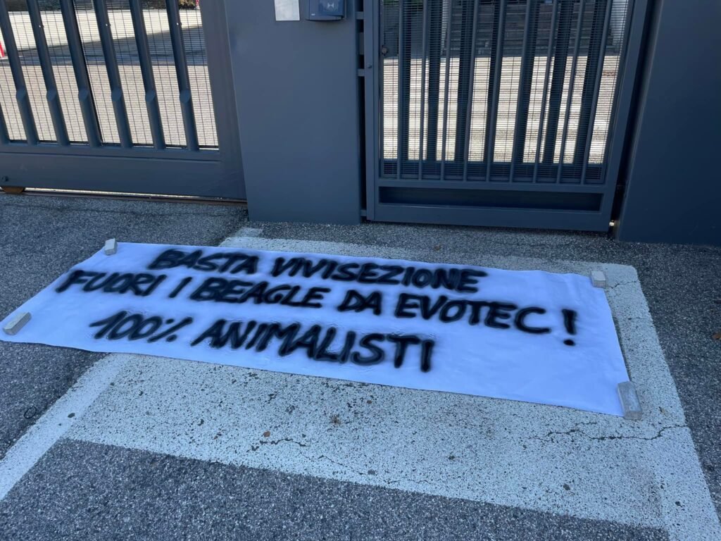 Durante il blocco è stato esposto uno striscione con scritto: BASTA VIVISEZIONE! FUORI I BEAGLE DA EVOTEC! 100%ANIMALISTI. Successivamente è intervenuta una pattuglia della Polizia di stato che ha identificato i presenti. Molti automobilisti erano d’accordo con la nostra protesta.