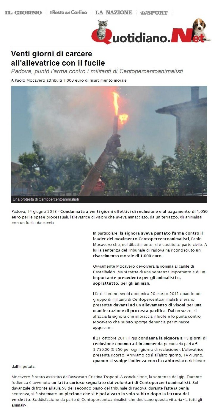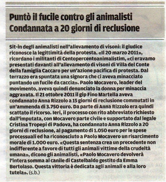 Domenica 20 marzo 2011 militanti di Centopercentoanimalisti si presentano davanti alla villa/allevamento di visoni di Villa del Conte della famiglia Caccaro per una azione pacifica di protesta. Dal terrazzo spunta fuori una signora che minaccia e punta contro i militanti un fucile da caccia. Paolo Mocavero (leader del movimento Centopercentoanimalisti) denuncia la signora per minaccia aggravata.