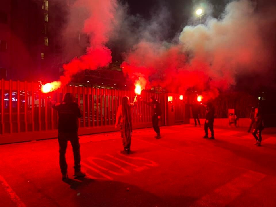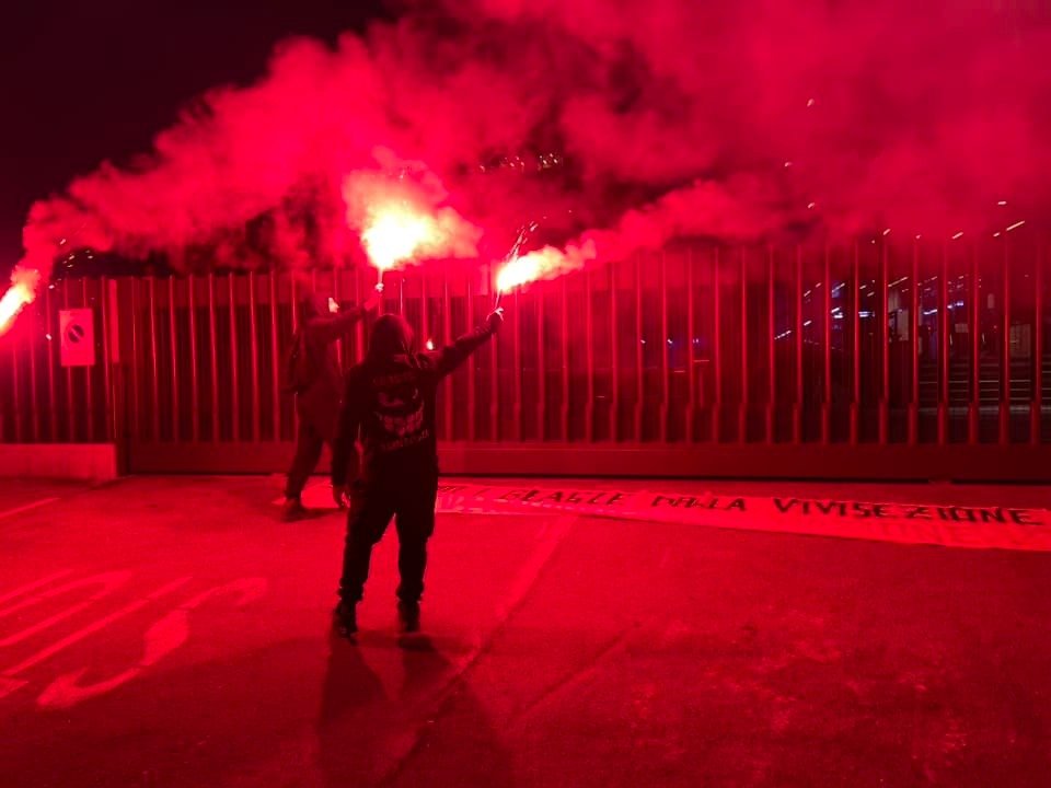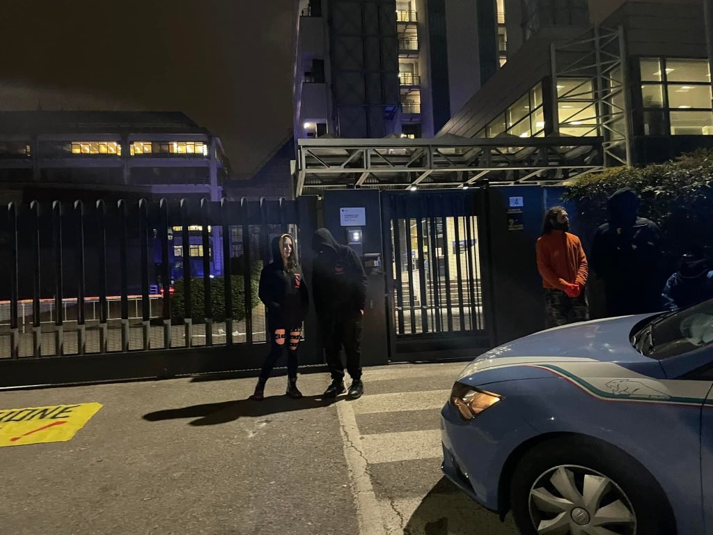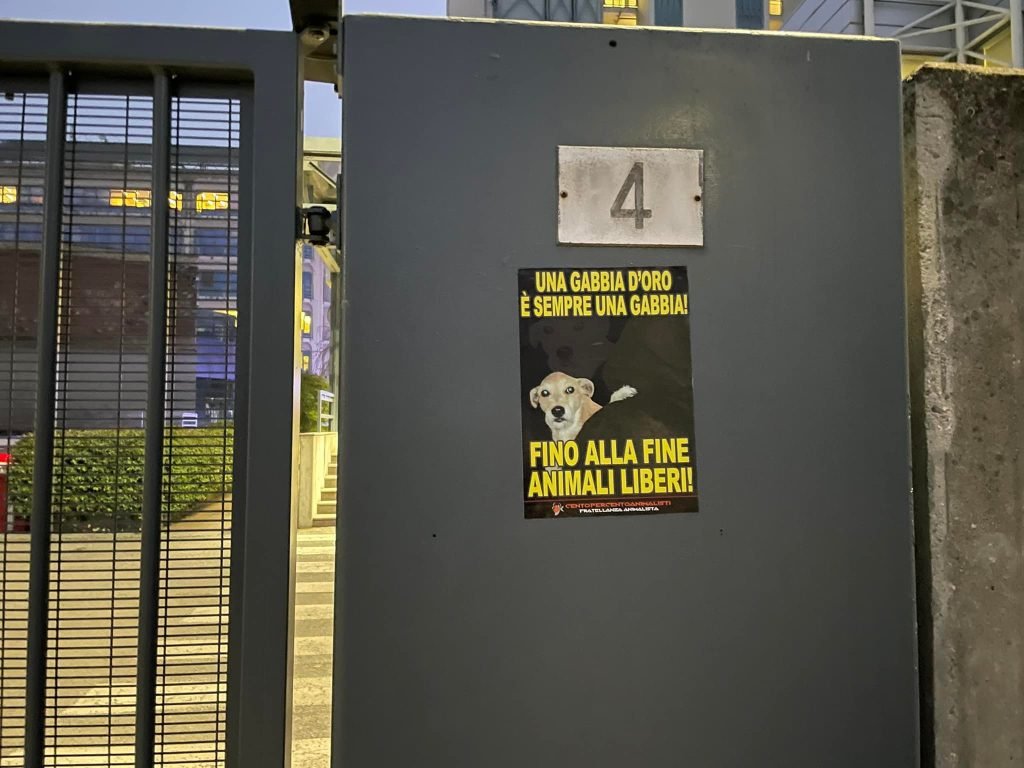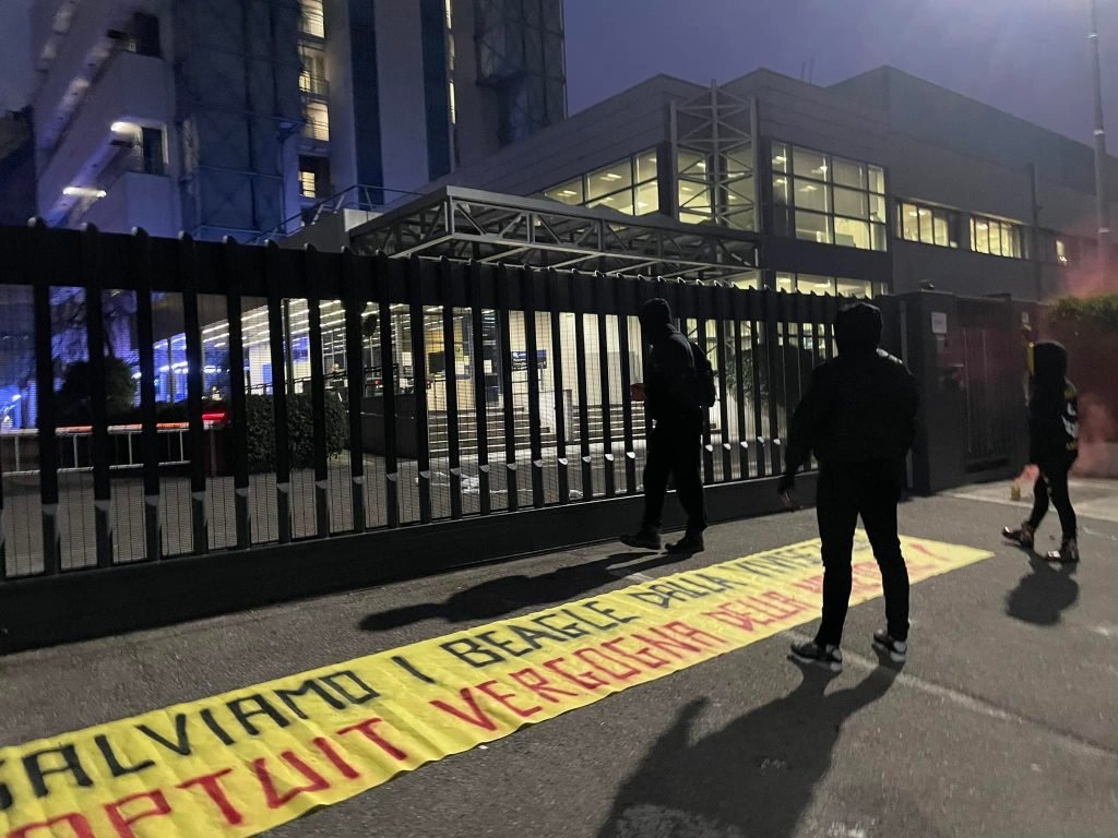 I Militanti hanno acceso numerosi fumogeni, lanciato rotoli di carta igienica all’interno della struttura, hanno intonato molti cori di scherno. I dipendenti di Aptuit, palesemente spaventati della presenza Animalista, sono rimasti chiusi all’Interno della struttura per tutta la durata del blitz allertando le forze dell’ordine.