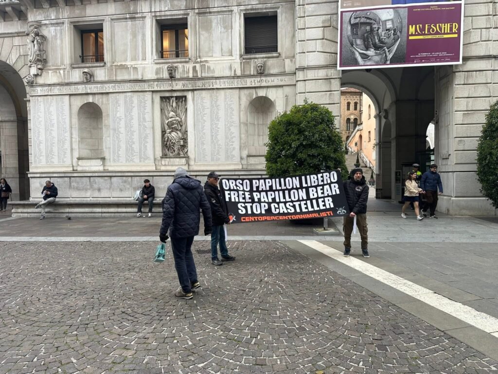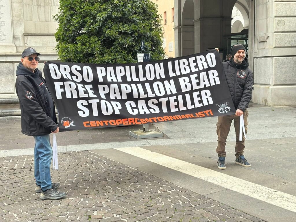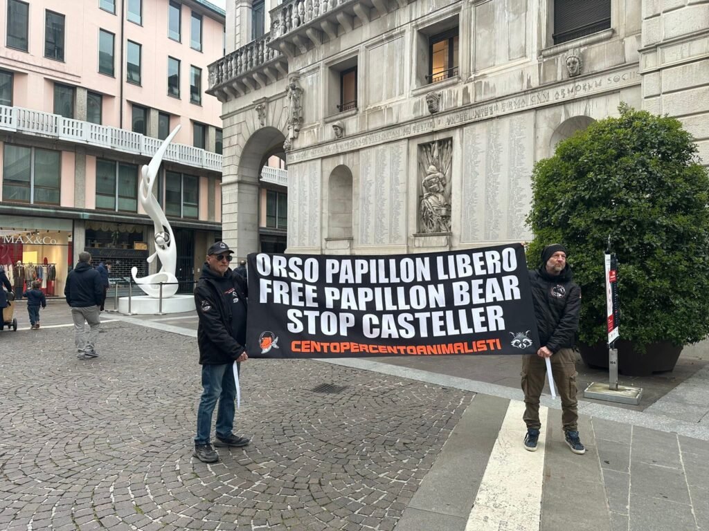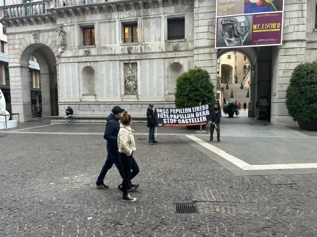 Giovedì 26 marzo, nel tardo pomeriggio, attivisti di CENTOPERCENTOANIMALISTI  hanno esposto uno striscione  nel centro di Padova, per ricordare la vicenda dell’Orso Papillon, recluso da  anni nel centro faunistico del Casteller (Trento).