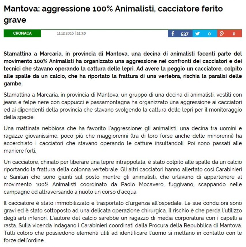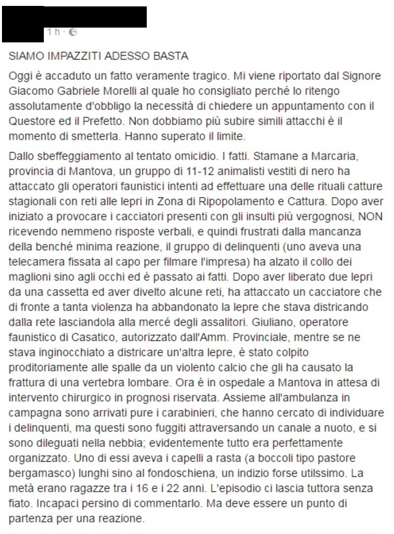 Sta girando nelle pagine dei cacciatori una notizia su un’aggressione subita da un cacciatore finito successivamente in ospedale. Se la notizia fosse confermata non me ne fotterebbe un cazzo, corcato o morto il cacciatore non va mai rispettato, il problema che questi signori attribuiscono la paternità del gesto a noi del Movimento Centopercentoanimalisti.