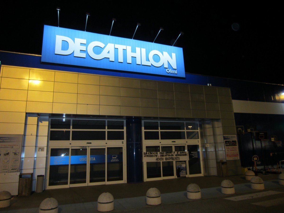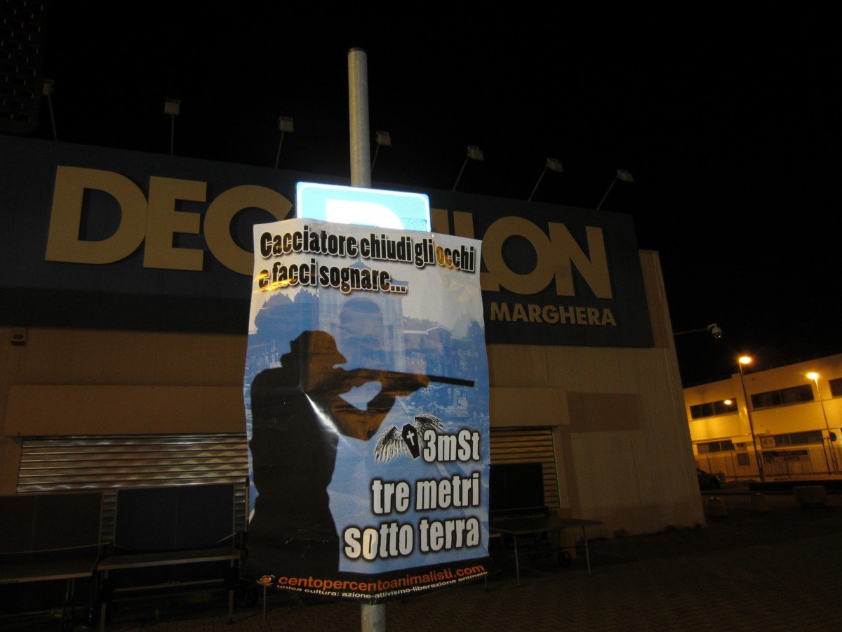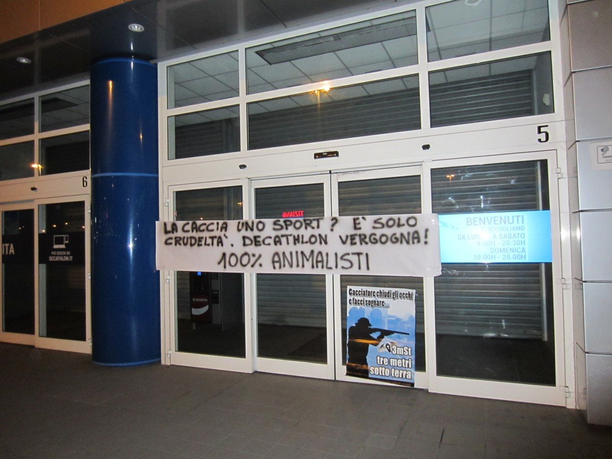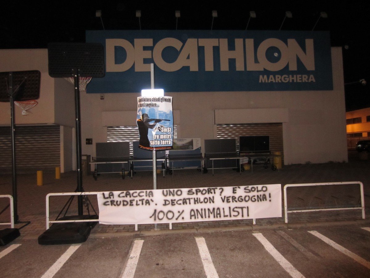 Decathlon dovrebbe avere maggior senso morale, al di là del vile guadagno. E i VERI sportivi dovrebbero indignarsi, e boicottare Decathlon se non chiuderà il reparto caccia. Nella notte tra il 6 e 7 aprile, Militanti del nostro Movimento hanno affisso manifesti contro la caccia e uno striscione presso le strutture di Olmi (Treviso) e Marghera (Venezia).