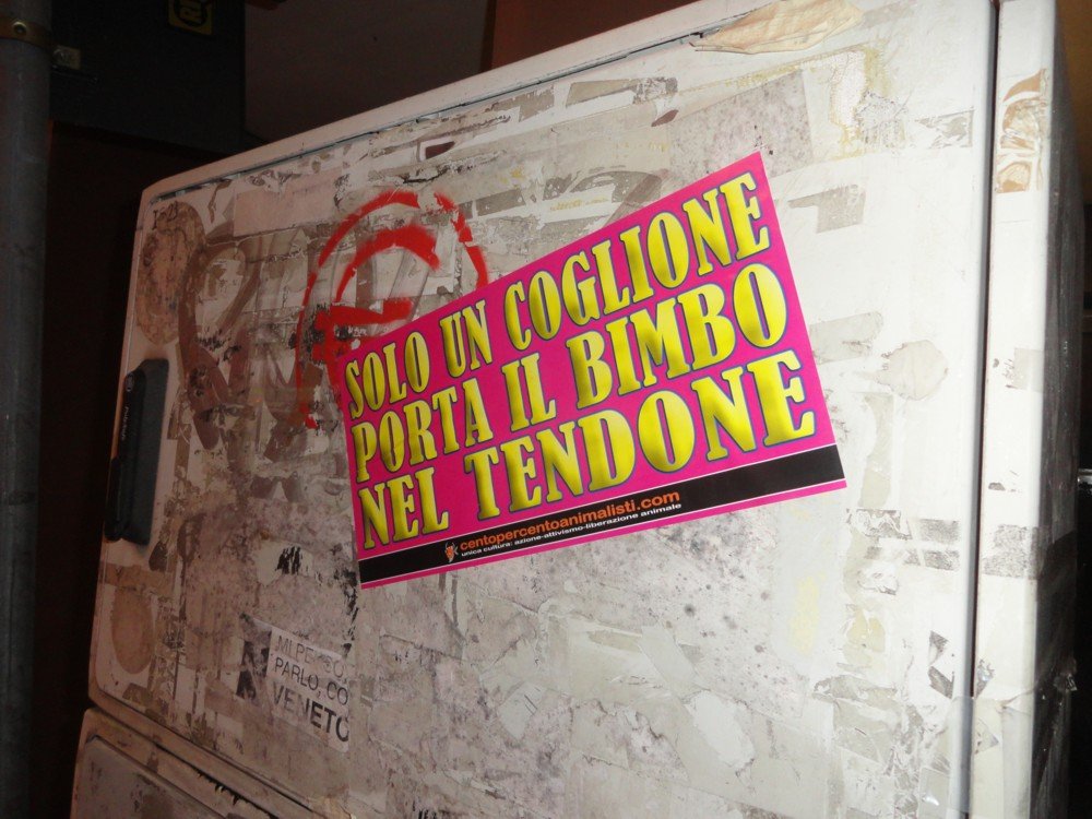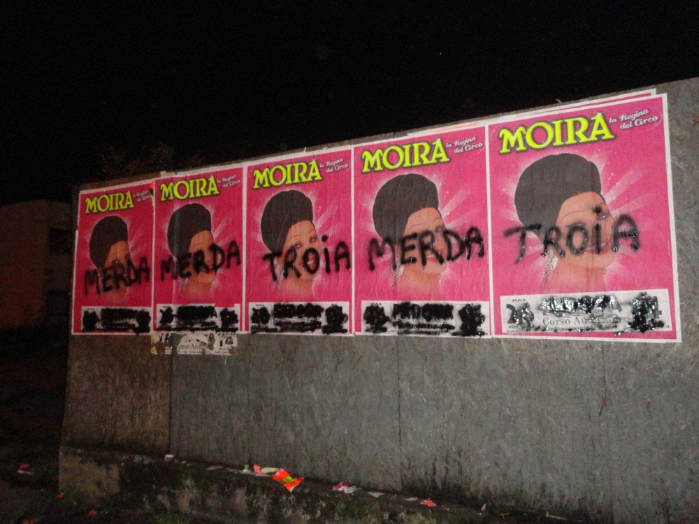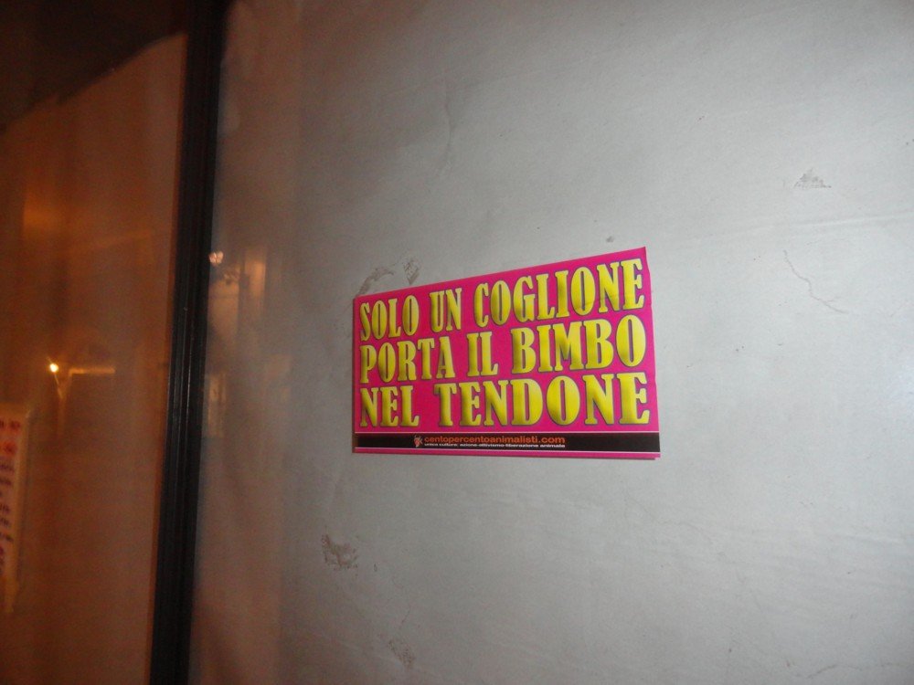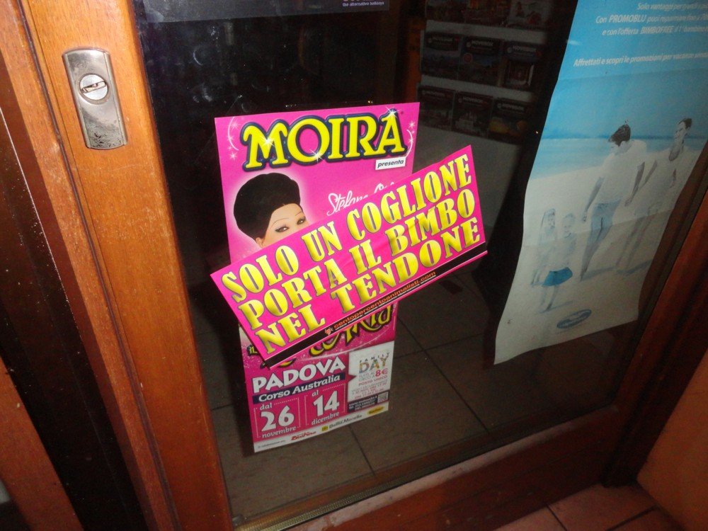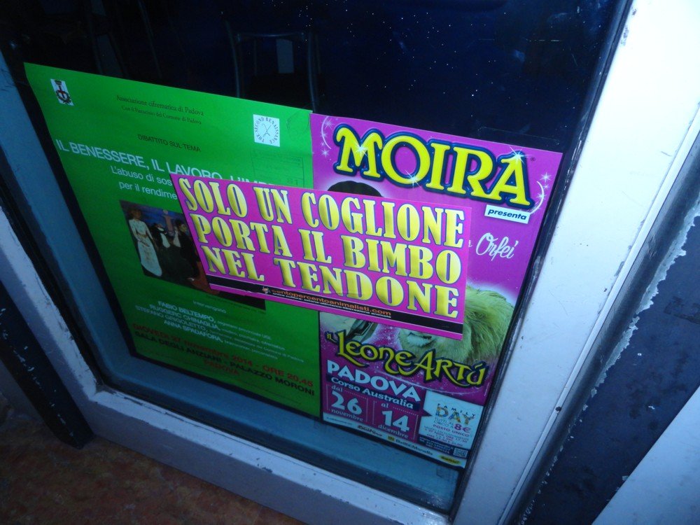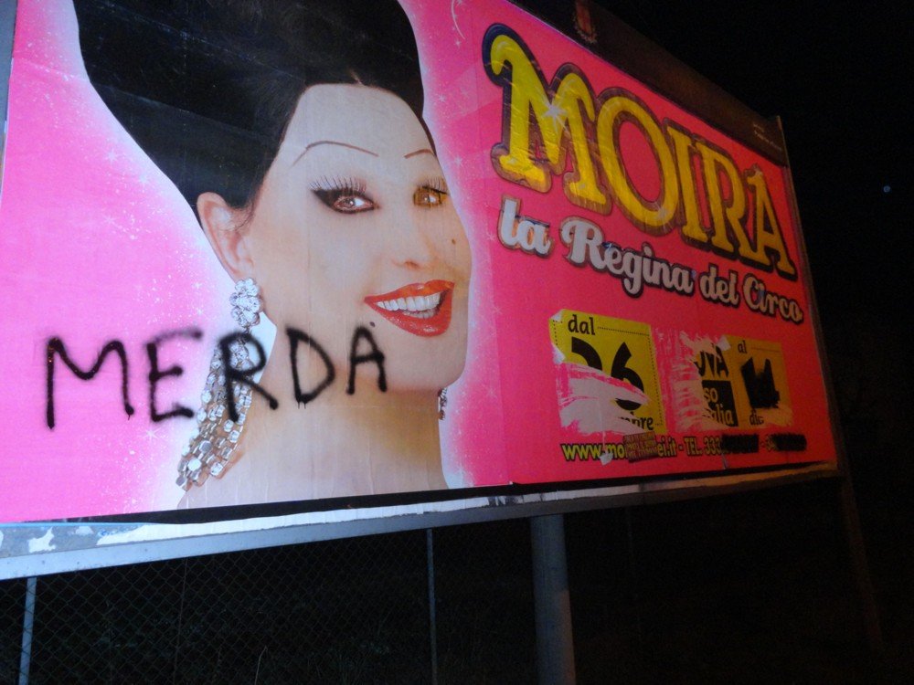 Nella notte tra il 9 e il 10 dicembre, militanti di CENTOPERCENTOANIMALISTI hanno ancora una volta mostrato alla Moira quanto sia sgradita la sua presenza a Padova oscurando con locandine adesive ironiche i suoi (pochi) manifesti rimasti intatti e “punendo” i negozianti che hanno sponsorizzato il suo spettacolo nelle vetrine, anche in quest’ultimo caso, pochi per fortuna, a dimostrazione di quanto l’azione di Centopercentoanimalisti sia stata efficace in città.