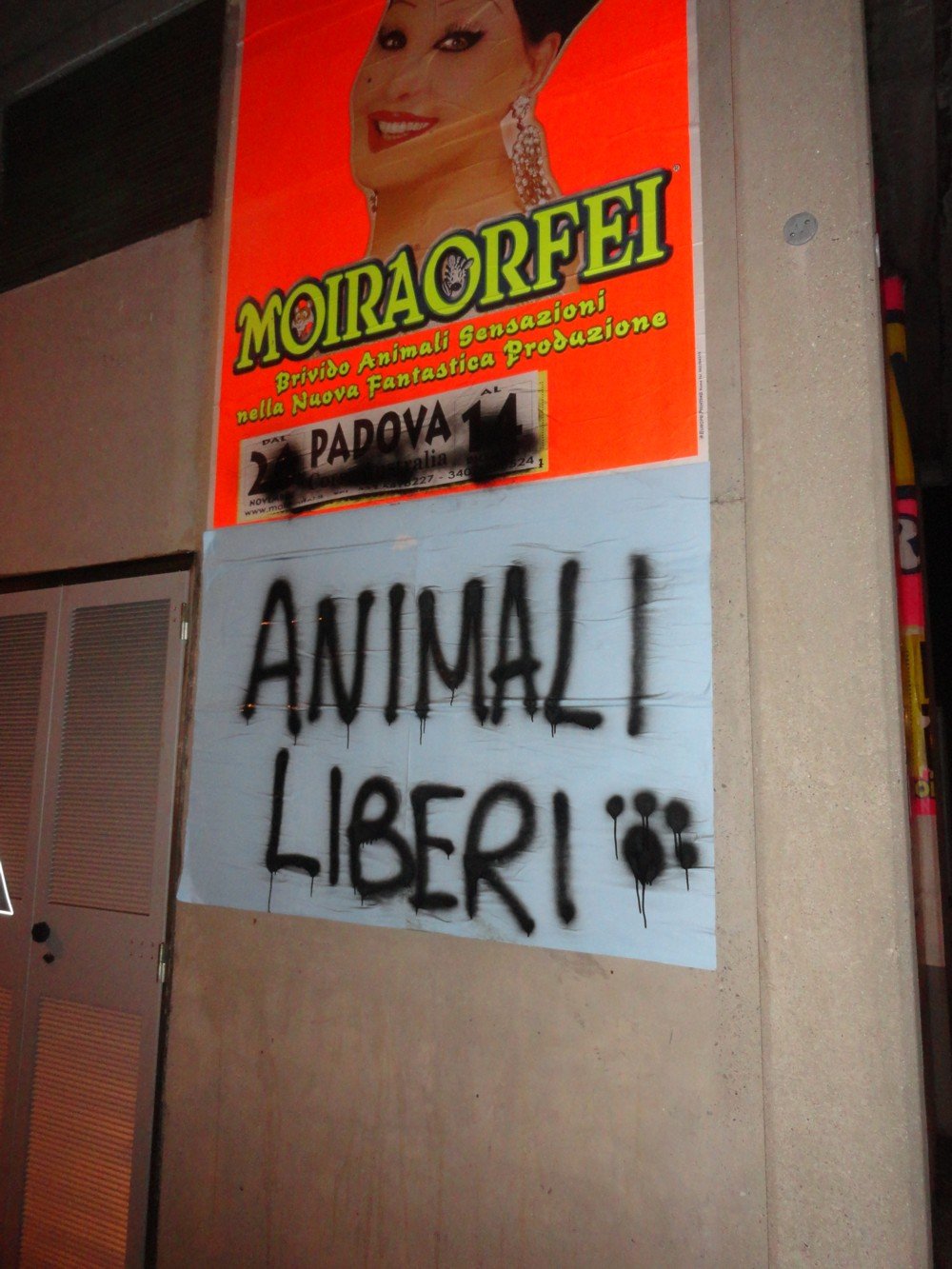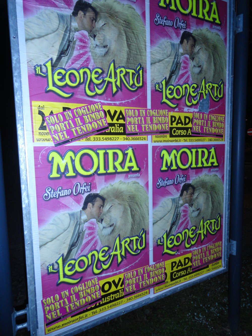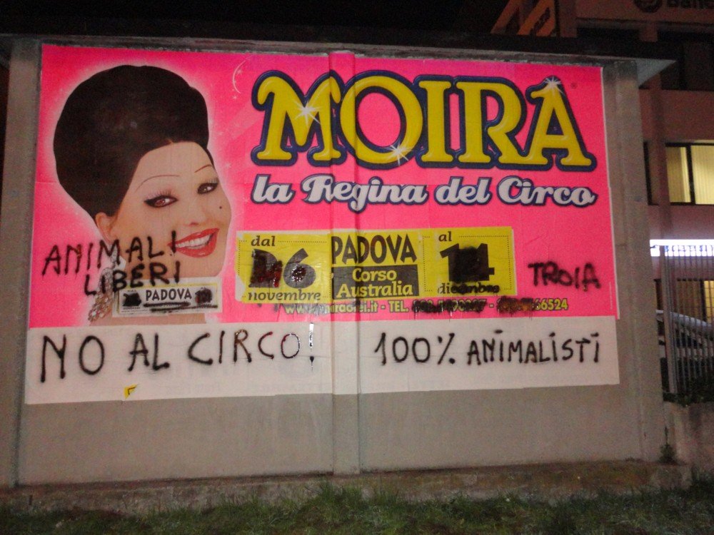Ci fa piacere sapere che l’affluenza di pubblico agli spettacoli del circo di Moira Orfei, a Padova, è stata scarsissima. Solo gente con livello culturale molto basso e sensibilità zero può continuare a dare i propri soldi per entrare nel maledetto tendone.