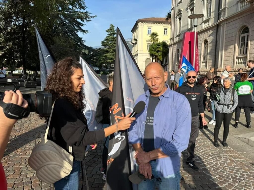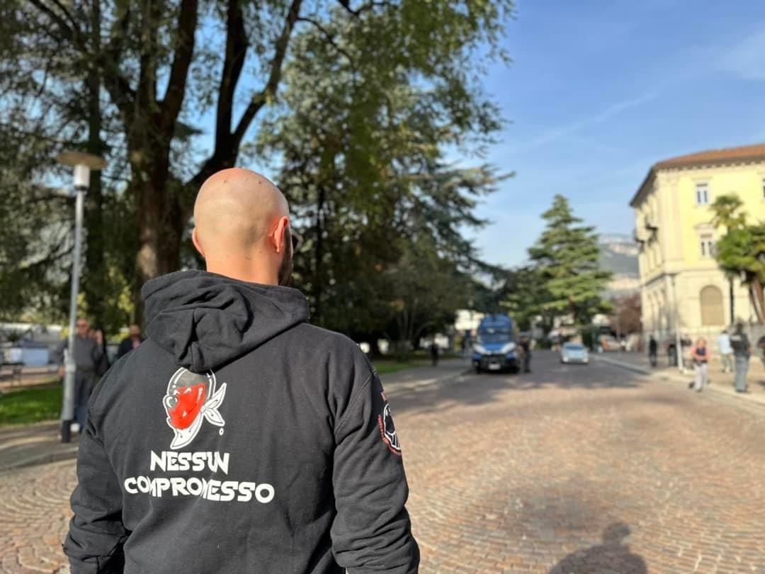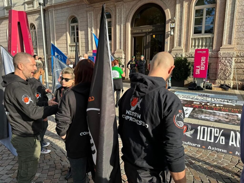 Manifestazione tranquilla fino a quando un’attivista ha notato il presidente della provincia, Mautrizio Fugatti uscire dalla porta di servizio. Da quel momento l’atmosfera si è riscaldata, Fugatti è stato circondato (e protetto) dalle FdO, inseguito dagli Animalisti per 150 metri, solo dopo gli Agenti sono riusciti a bloccare l’accerchiamento.
