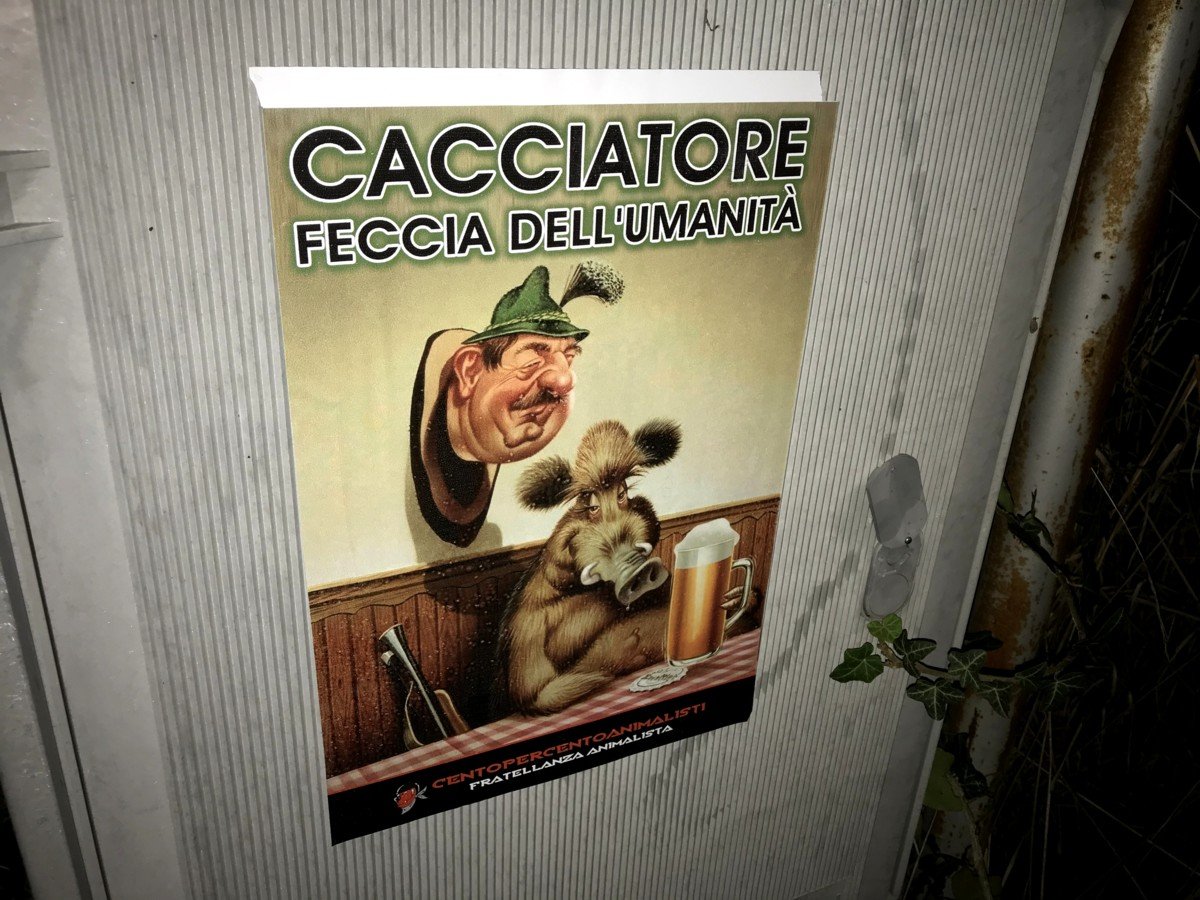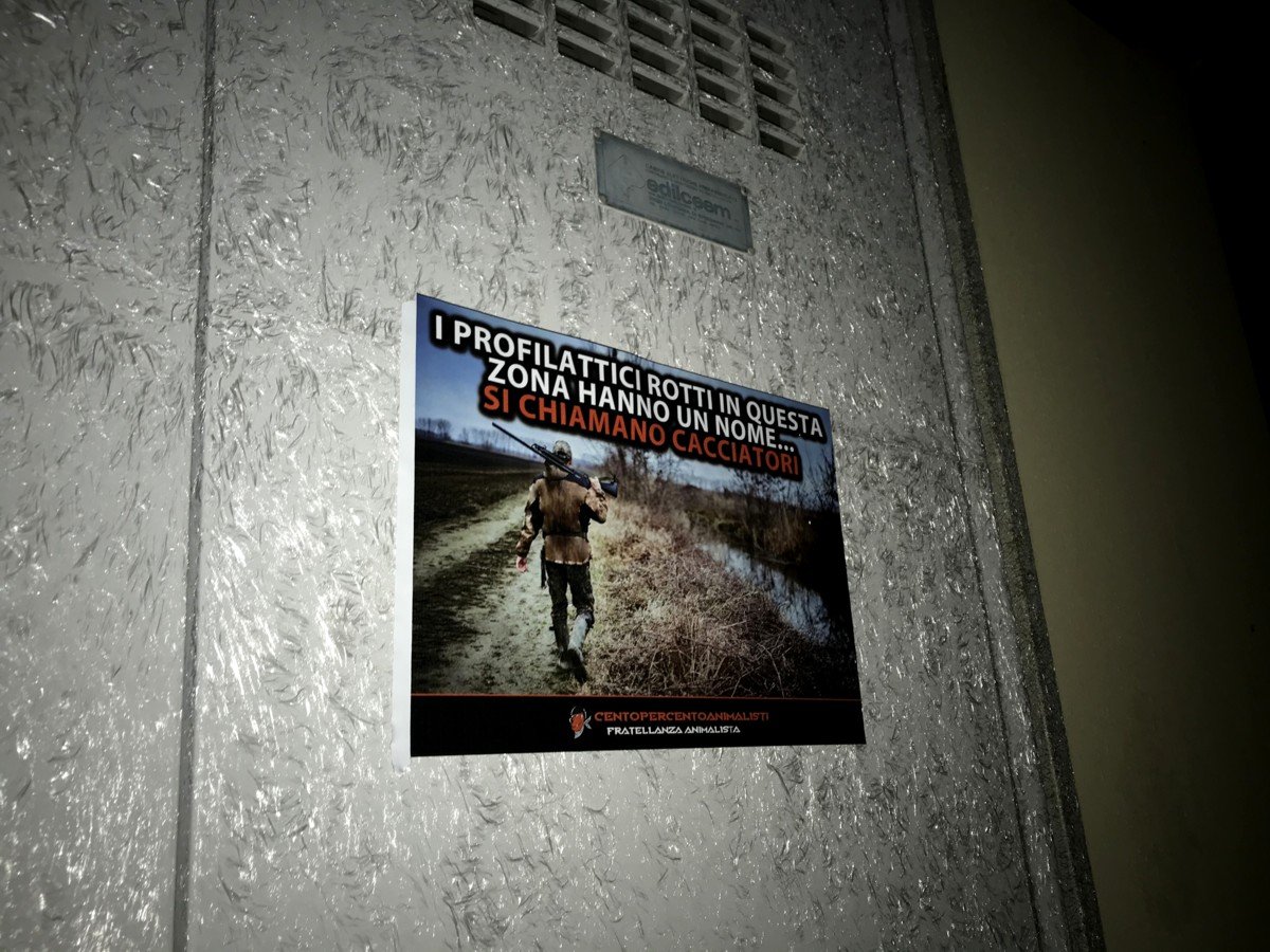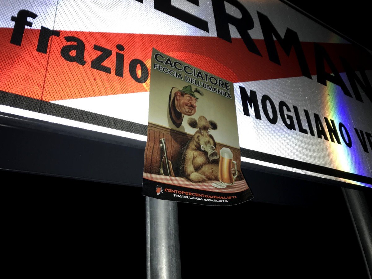 Militanti di CENTOPERCENTOANIMALISTI, nella notte tra il 29 e 30 settembre, hanno affisso manifesti anticaccia e fortemente sarcastici in località Zerman a Mogliano (Treviso), soprattutto dove di solito parcheggiano le auto i cacciatori. Già che c’erano, gli Attivisti hanno tappezzata anche un parcheggio ai limiti del Bosco di Mestre, parco pubblico dove la caccia è vietata, ma gli assassini legalizzati se ne fregano a quanto pare.
