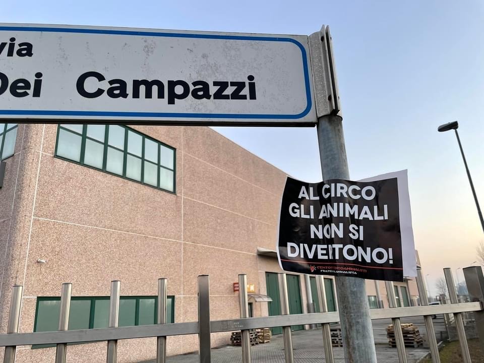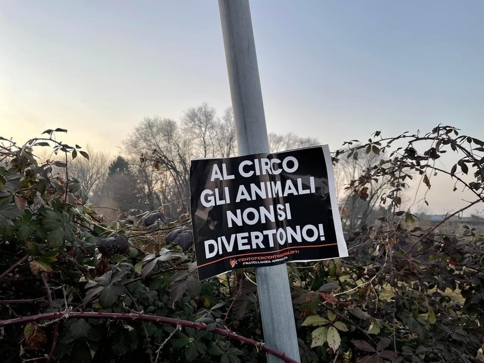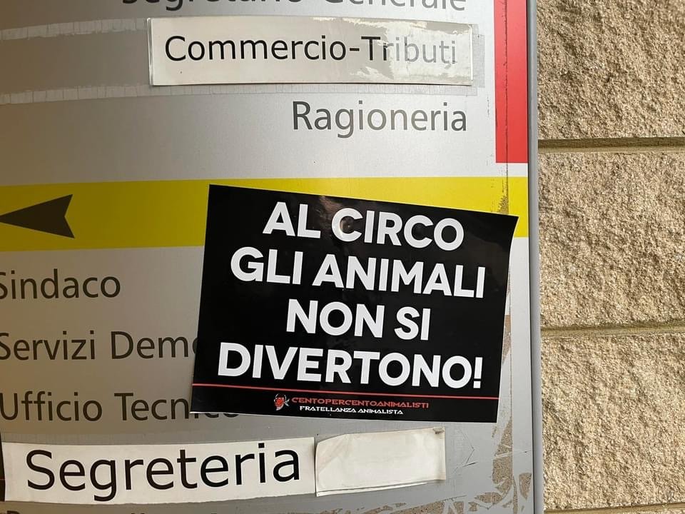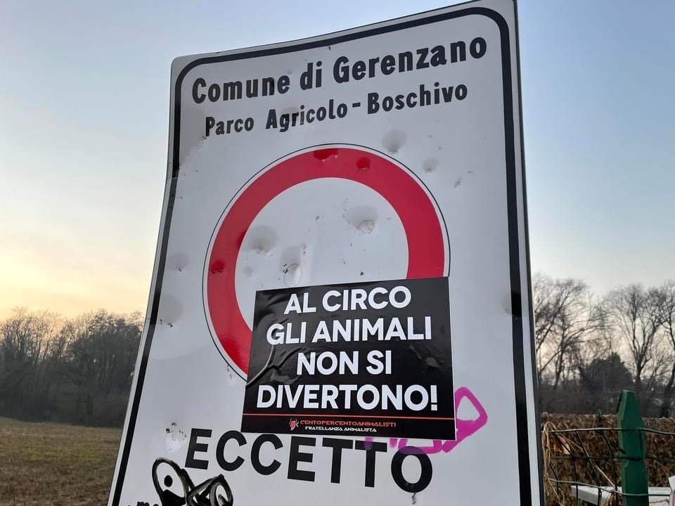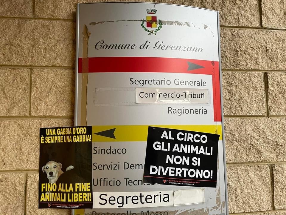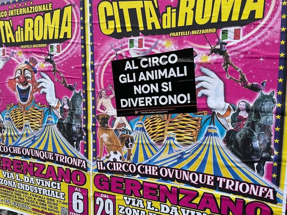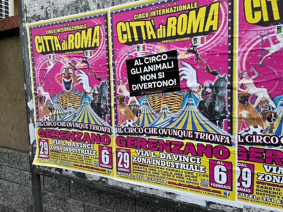 Per ricordare a tutti che “al circo gli Animali non si divertono”, Militanti del Movimento Centopercentoanimalisti, nel tardo pomeriggio di domenica 23 gennaio, hanno affisso manifesti vs il circo nella zona industriale di Gerenzano dove il circo si attenderà, all’ingresso dell’ufficio del Sindaco Municipio e “oscurato” alcuni cartelloni del circo di Roma affissi nel paese del Varesotto