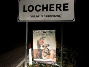 Nella notte tra lunedì 11 e martedì 12 novembre, Militanti del Movimento Centopercentoanimalisti hanno affisso un manifesto ironico bene in vista vs i cacciatori sul cartello stradale d’ingresso in località “Lochere” (Caldonazzo- Trento) dove si terranno i “corsi cinofili dei cacciatori per ricordare agli assassini legalizzati cosa realmente sono…