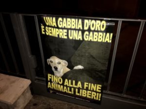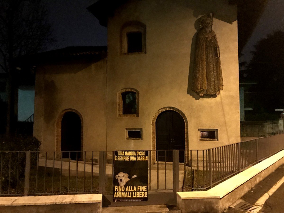 Nella notte tra il 5 e 6 dicembre, i nostri Militanti hanno affisso un manifesto sul cancello della Chiesa di sant’Antonio Abate a Saronno per far capire che non ci siamo dimenticati della sagra. Gli organizzatori per giustificare la vergogna, hanno sempre detto che gli Animali sono trattati bene, il nostro manifesto invece parla chiaro: “Una gabbia d’oro è sempre una gabbia! Fino alla fine Animali liberi!”.