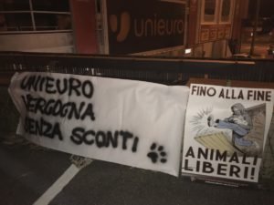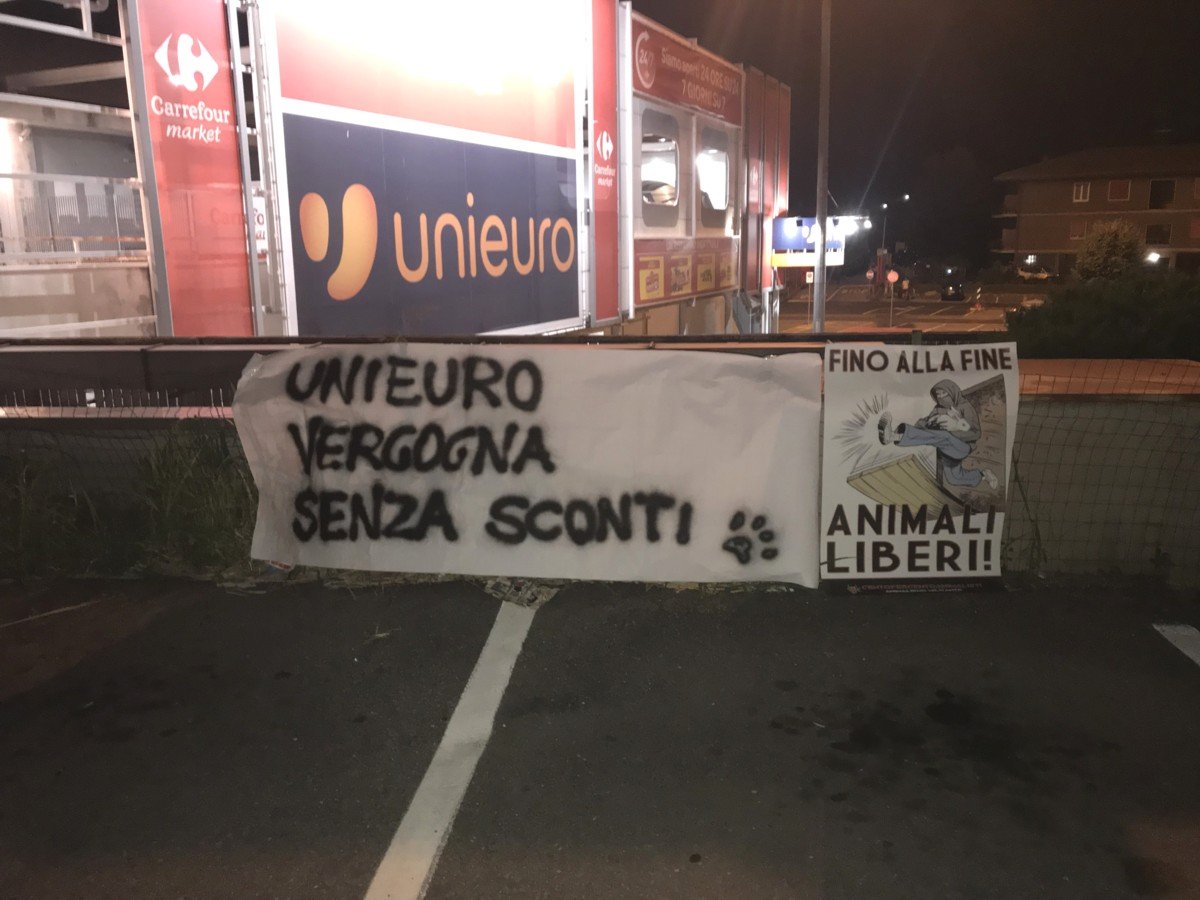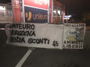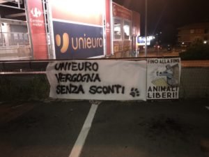 Nella notte tra l’11 e 12 luglio i nostri Militanti hanno affisso uno striscione con scritto “unieuro vergogna senza sconti” e un manifesto di Liberazione Animale sulle recinzioni di Unieuro a Tradate (VA), la nota catena di elettrodomestici faccia un passo indietro, ritiri lo spot come fece la prestigiosa Golden Lady anni fa a causa delle nostre proteste per uno spot analogo.