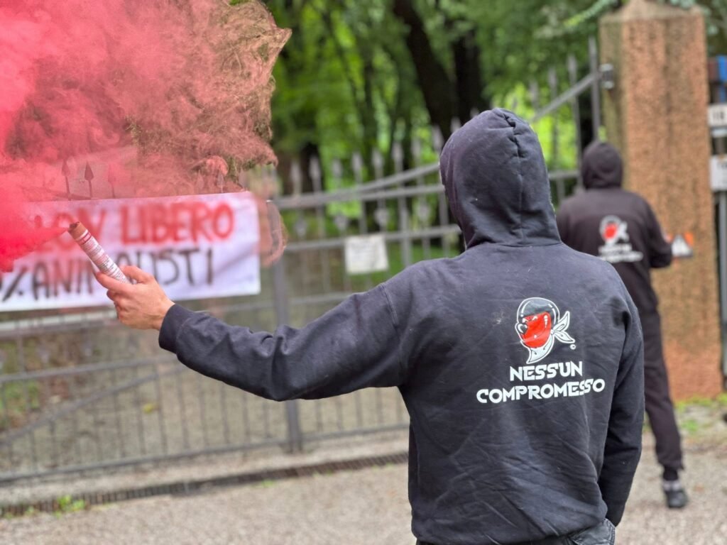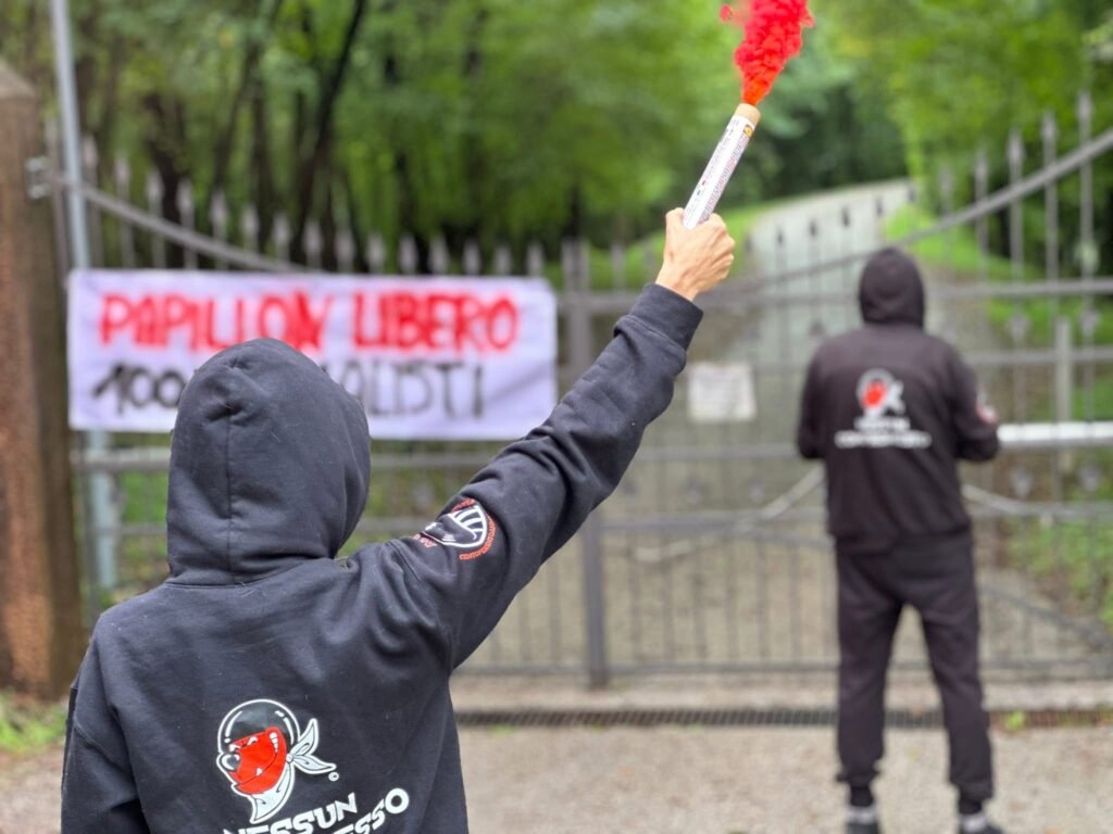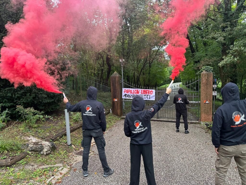 Inoltre, hanno affisso uno striscione che invoca la liberazione di Papillon e acceso dei fumogeni (ecologici), per far sentire a Papillon la nostra presenza. Non lo lasceremo solo!
