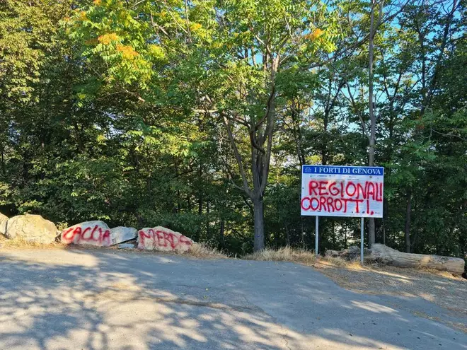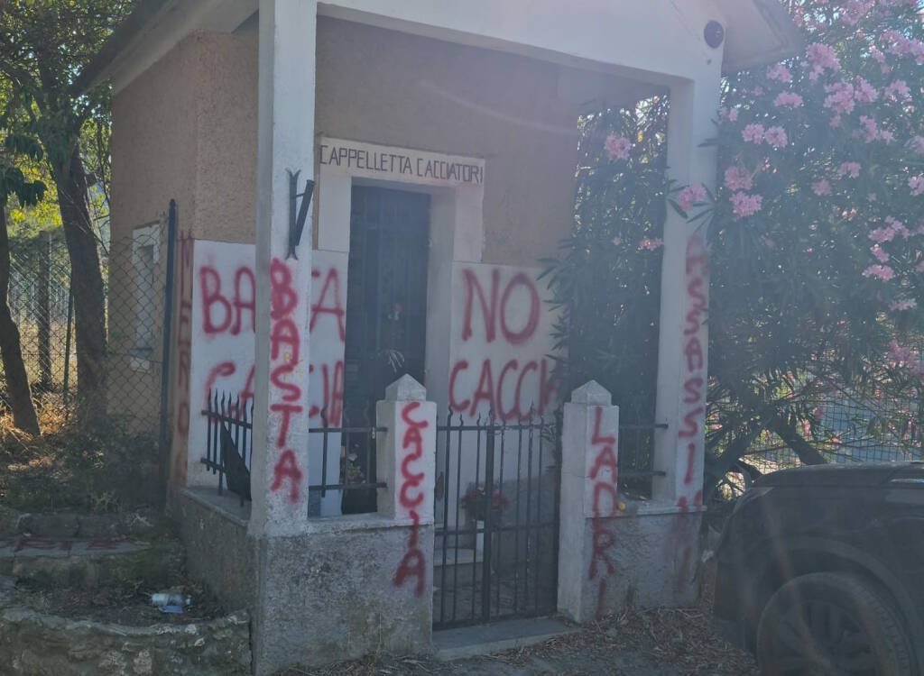 Genova, 15 luglio 2022. “Ladri e assasini”, “Caccia m…a” e un laconico “Regionali corrotti”. Queste sono alcune delle scritte comparse questa notte sui muri e sulle pietre della ‘Cappelletta dei Cacciatori” sopra Sant’Eusebio.