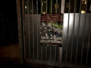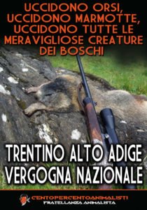 Non ci sono scuse al massacro: è solo la volontà dei politicanti locali di dare ai cacciatori un’altra creatura su cui sfogare la loro mania assassina. In cambio di voti, ovviamente. Chi ama gli Animali (e la Montagna) deve agire, cominciando dal boicottare la regione e i suoi prodotti. Militanti di CENTOPERCENTOANIMALISTI, nella notte tra 5 e il  6 novembre  hanno affisso sui cancelli delle tribune dell’Euganeo a Padova manifesti diretti alla Regione più sanguinaria d’Italia per denunciare la loro vergogna quotidiana. Nella speranza di portare bene al Padova e che  vinca l’incontro come hanno  fatto il Seregno (Levico Terme) e Legnano (Dro) la settimana scorsa, continueremo ad usare ogni mezzo legittimo per denunciare questa Regione arrogante e sanguinaria nei confronti degli Animali.
