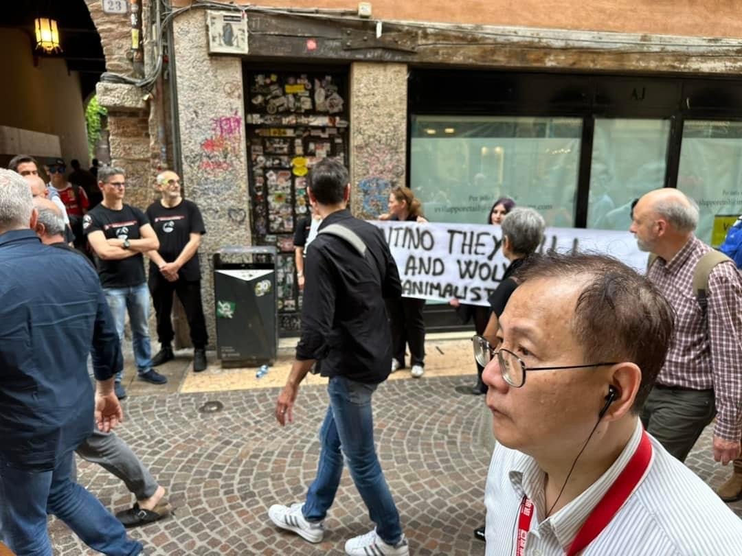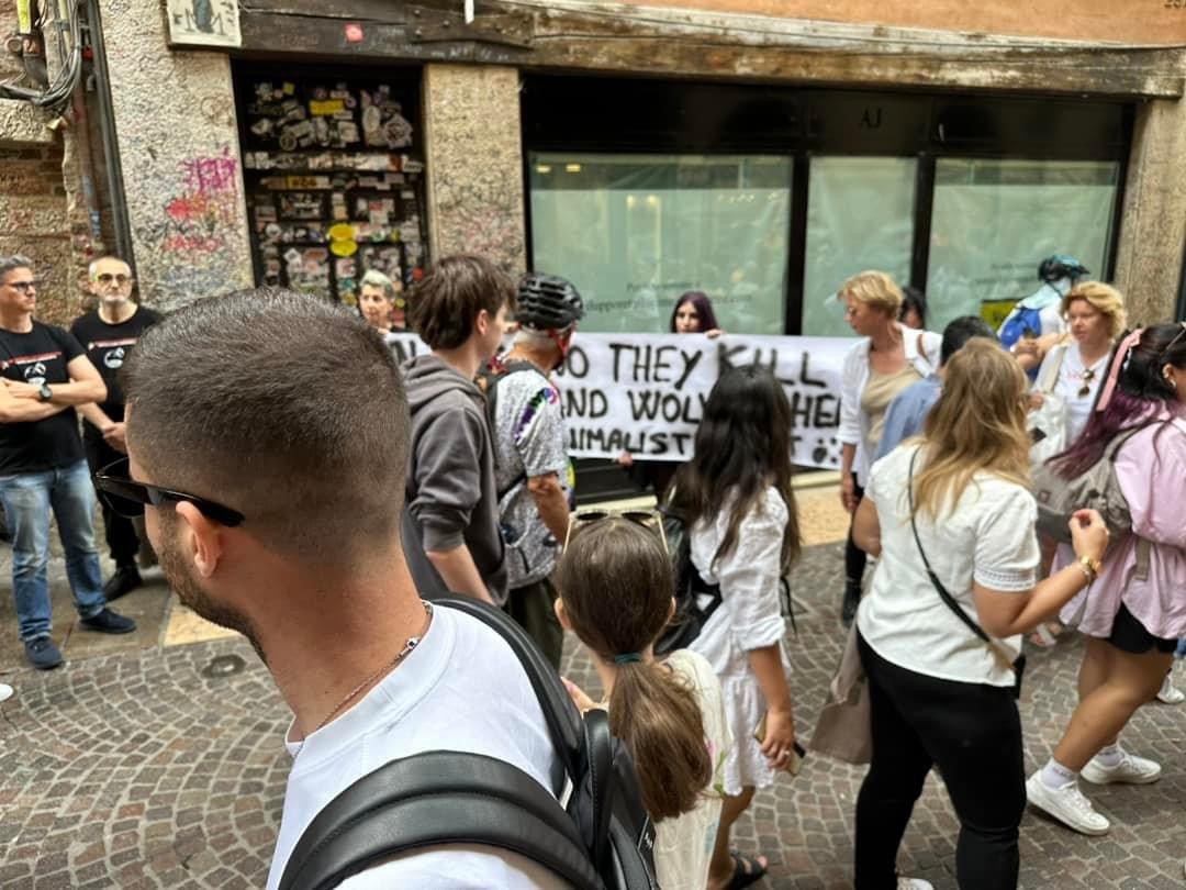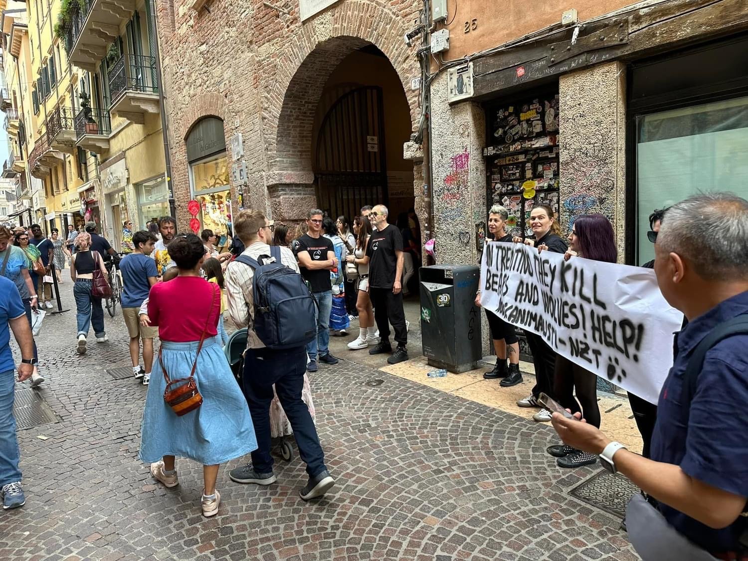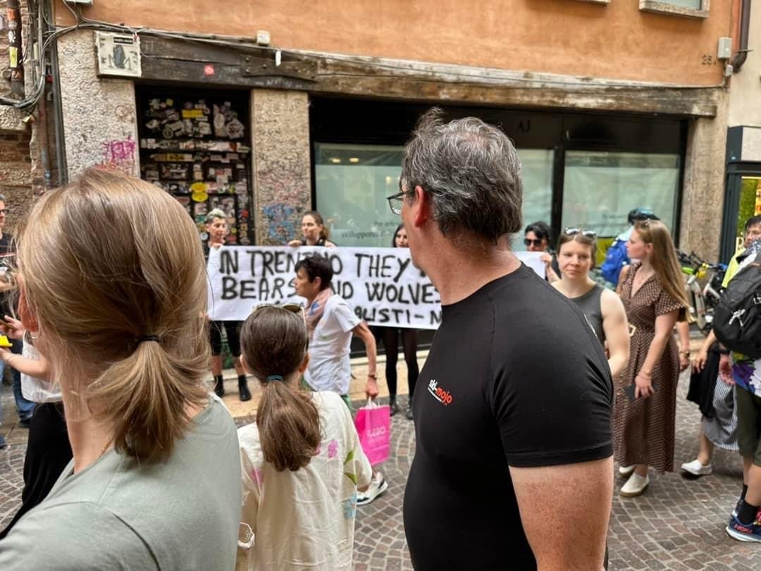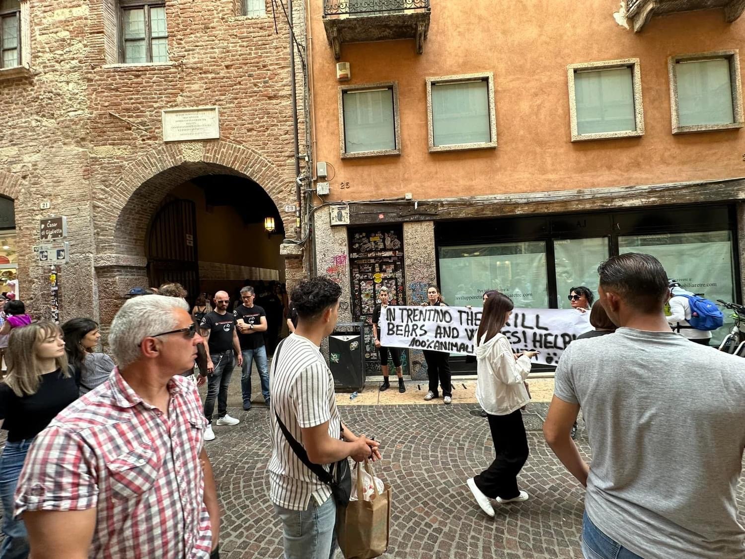 Domenica 2 giugno alcuno militanti del Movimento Centopercentoanimalisti si sono recati in via Cappello, davanti ala Casa di Giulietta, con uno striscione in lingua inglese per denunciare la politica distruttiva delle giunta trentina, contro gli Animali Liberi, in primo luogo Orsi e Lupi da tempo nel mirino dei cacciatori e del presidente Fugatti.