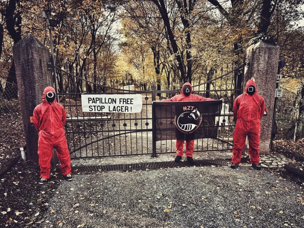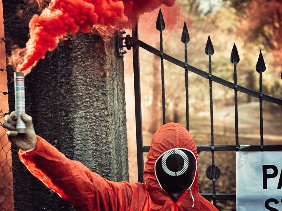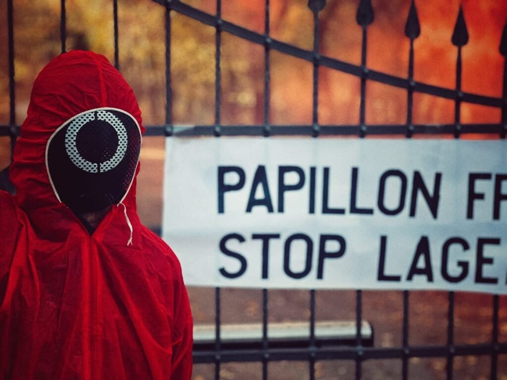 I Militanti per l’occasione, si sono travestiti, non a caso, con costumi della serie televisiva Coreana di grande successo, “Squid Game”. I famosi soldati che indossano delle tute, ognuno con un disegno geometrico diverso sulla maschera, che rappresenta un ruolo ben distinto, ma tutti complici della sofferenza e della crudeltà.