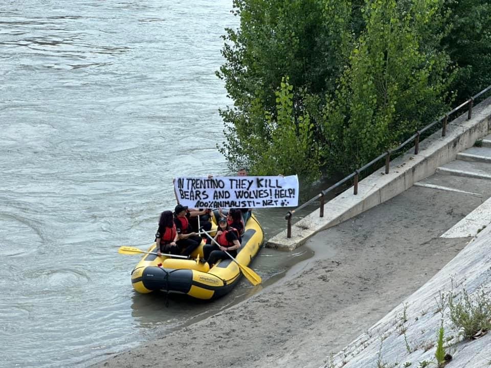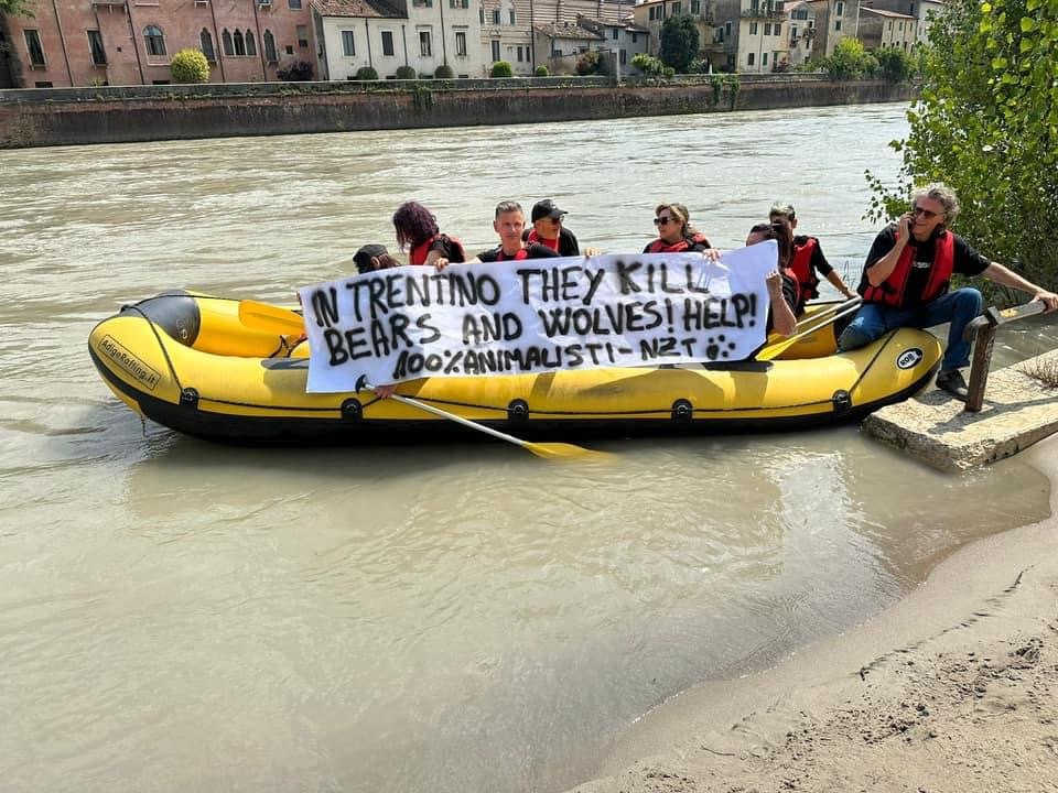I militanti del Movimento hanno disceso l’Adige in gommone, passando attraverso il centro di Verona, esponendo uno striscione di denuncia: lo scopo è far conoscere la politica della giunta provinciale di Trento che insistono nella criminalizzazione degli Animali e nella ricerca di ogni pretesto perabbatterli: in questo seguono i desideri di cacciatori, speculatori, allevatori, insomma la parte più arretrata della popolazione trentina.