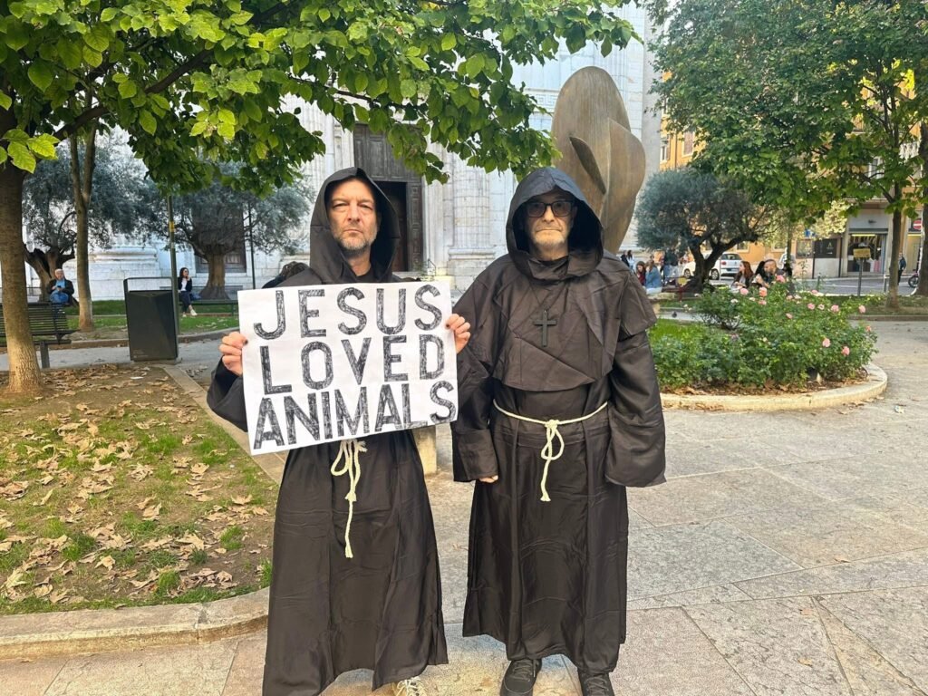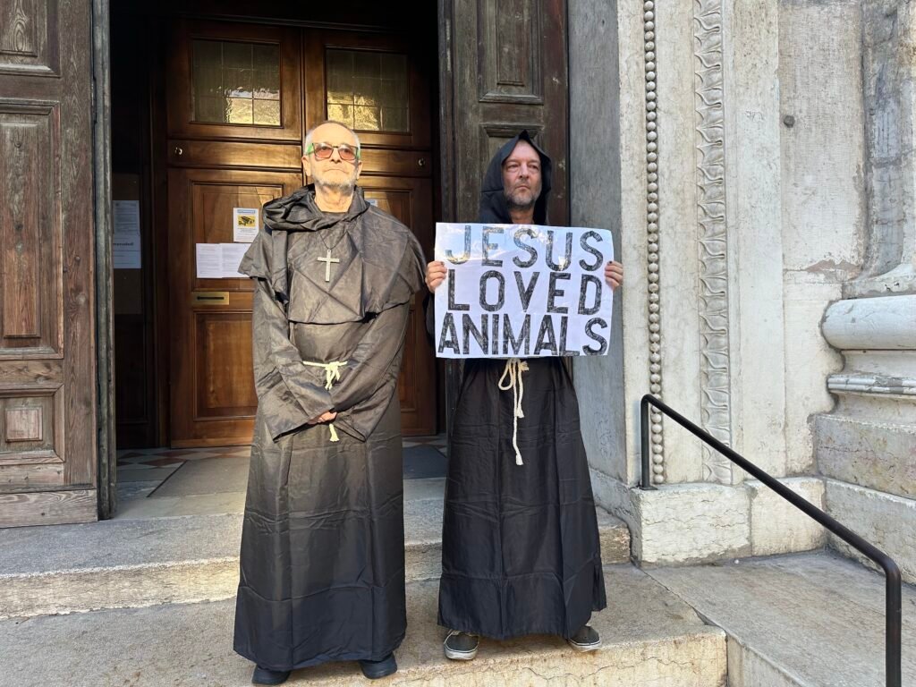 Dopo lo striscione appoggiato nel sagrato della chiesa alcune settimane fa, nel pieno pomeriggio di venerdì 3 ottobre, i nostri Militanti sono tornati in azione travestiti da frati e sono entrati nella chiesa di San Niccolò all’Arena, con un cartello in lingua inglese diretto ai turisti, con scritto: “Jesus loved Animals”.