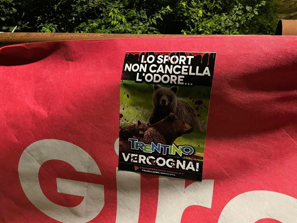 Noi diciamo: “lo sport non cancella l’odore”. Per questo abbiamo fatto numerose azioni negli ultimi anni, quando giocavano (basket o calcio) le squadre Trentine. Questa volta lo sport passa per le strade del Trentino con il giro d’Italia. Una competizione così prestigiosa non può far dimenticare però, le vergogne di una terra bellissima dal punto di vista naturalistico e faunistico, abitata dalla stragrande maggioranza, da persone per bene. Tuttavia, una terra macchiata troppe volte dal sangue innocente degli Animali.