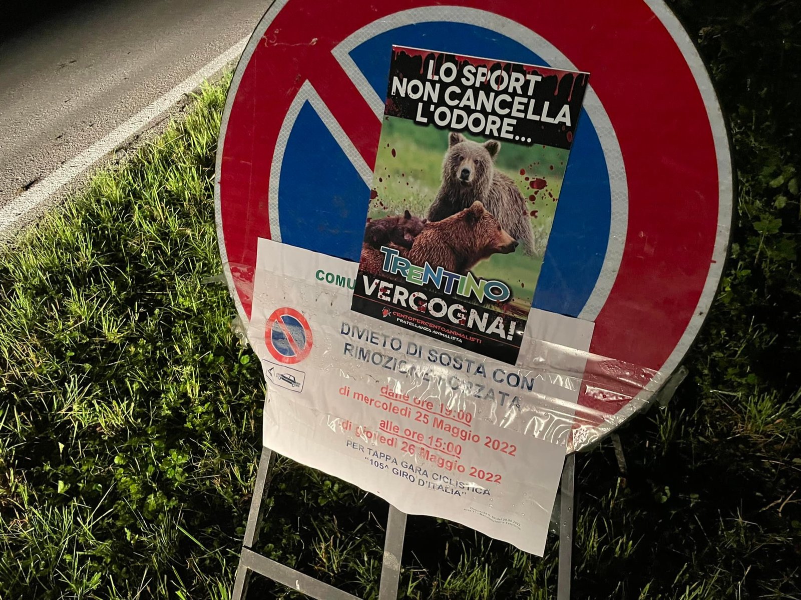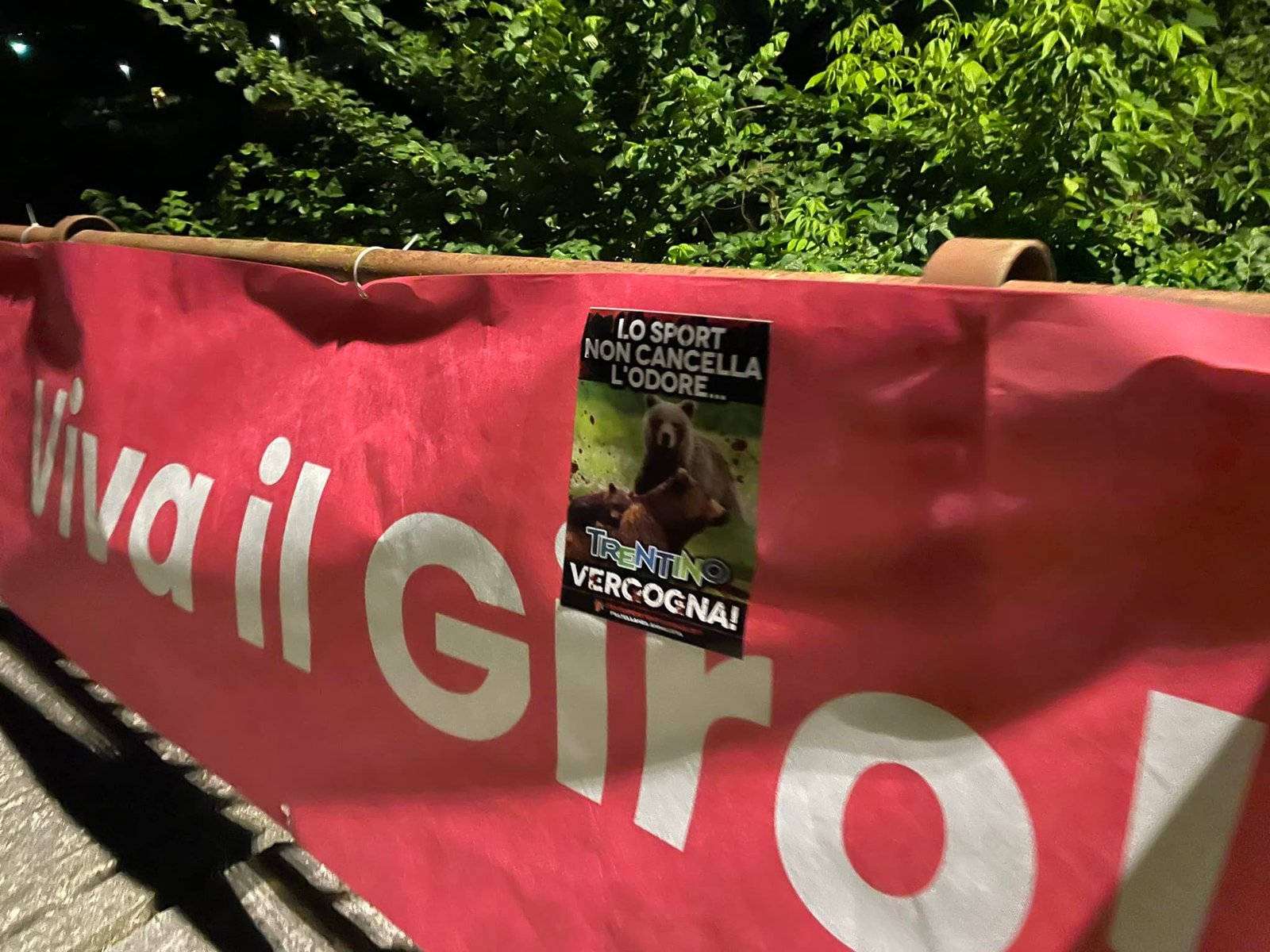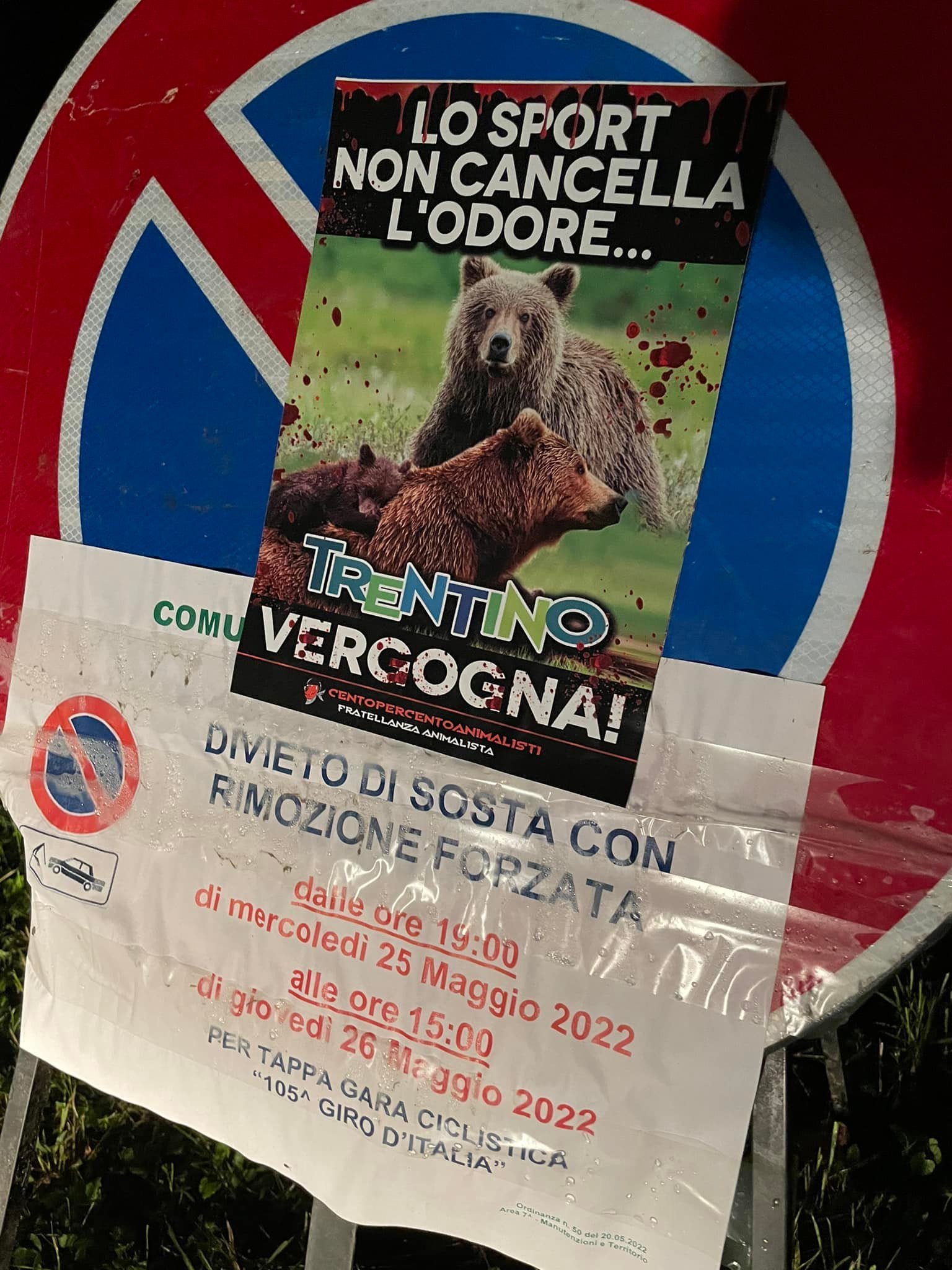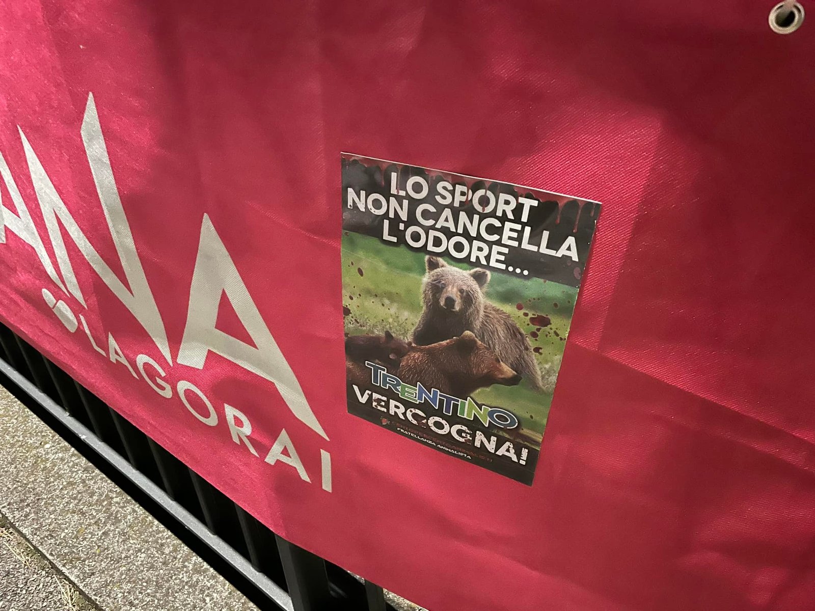 Noi diciamo: “lo sport non cancella l’odore”. Per questo abbiamo fatto numerose azioni negli ultimi anni, quando giocavano (basket o calcio) le squadre Trentine. Questa volta lo sport passa per le strade del Trentino con il giro d’Italia. Una competizione così prestigiosa non può far dimenticare però, le vergogne di una terra bellissima dal punto di vista naturalistico e faunistico, abitata dalla stragrande maggioranza, da persone per bene. Tuttavia, una terra macchiata troppe volte dal sangue innocente degli Animali.