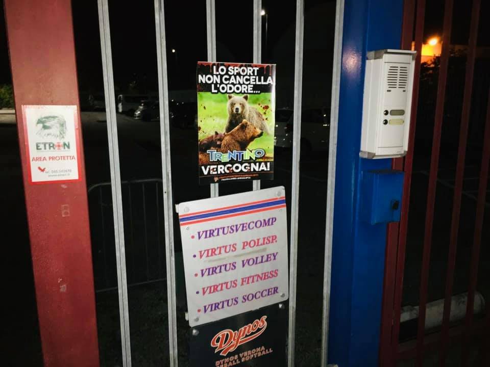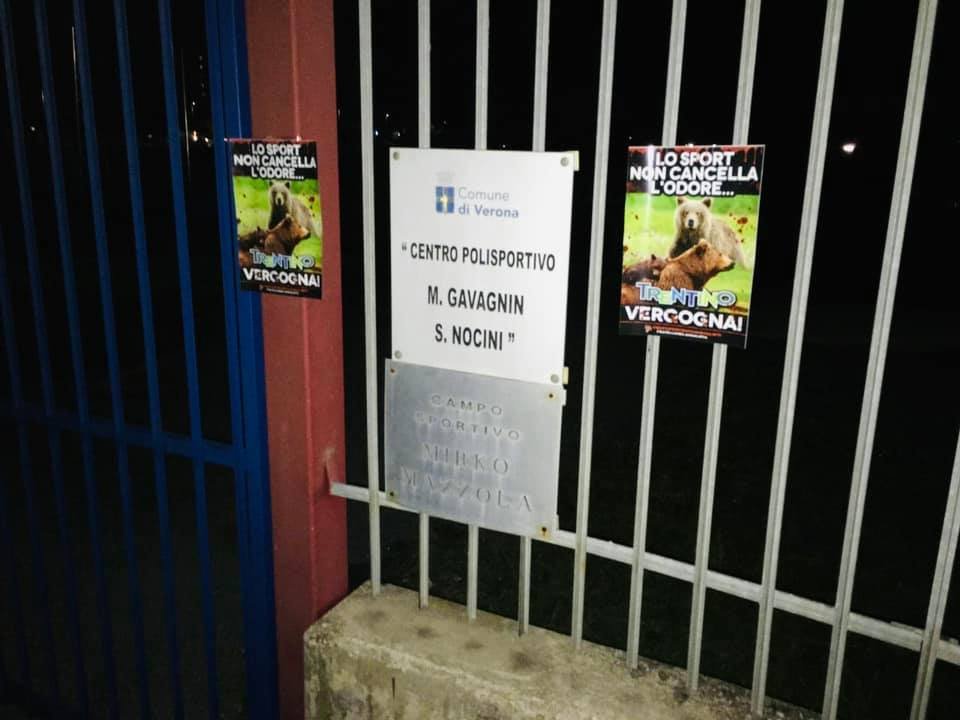 Alla vigila della partita Virtus Verona vs Trento (girone A della serie C), Militanti di Centopercentoanimalisti, per ricordare le nefandezze di quella terra, famosa soprattutto per aver ucciso e imprigionato dei poveri Orsi, nella notte tra il 6 e 7 novembre, hanno tappezzato con manifestini adesivi lo stadio “Mario Cavagnin Sinibaldi Nocini in zona borgo Venezia a Verona.