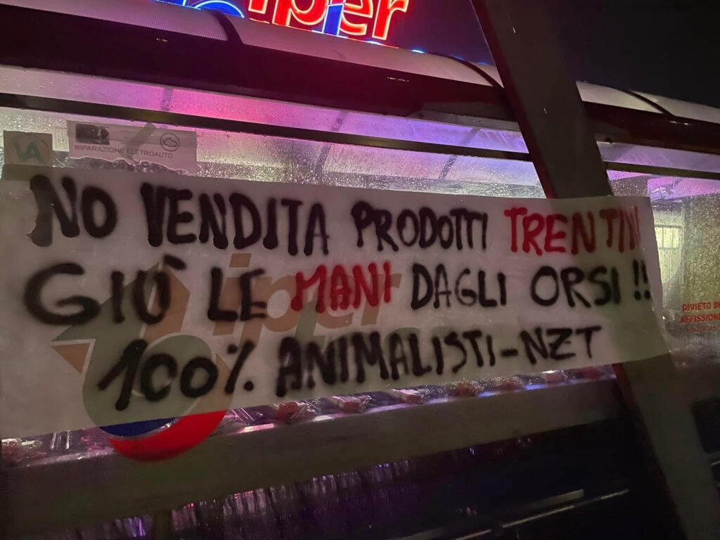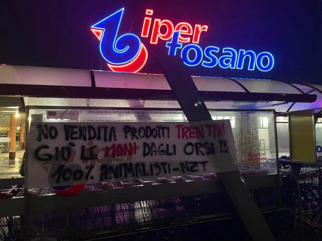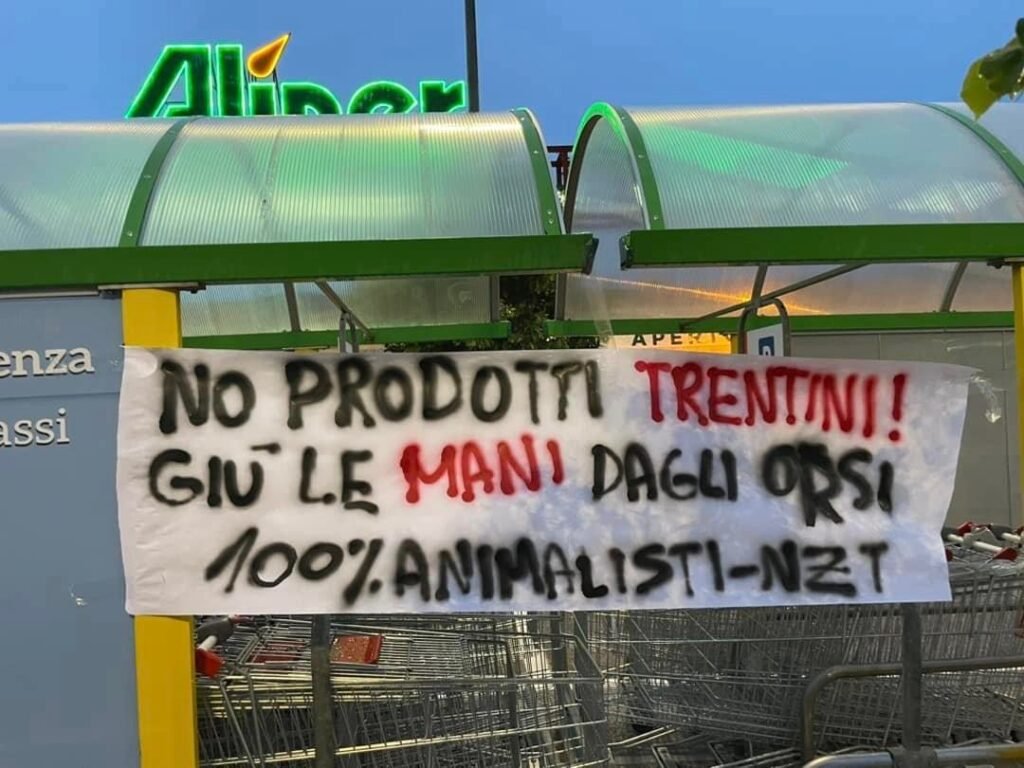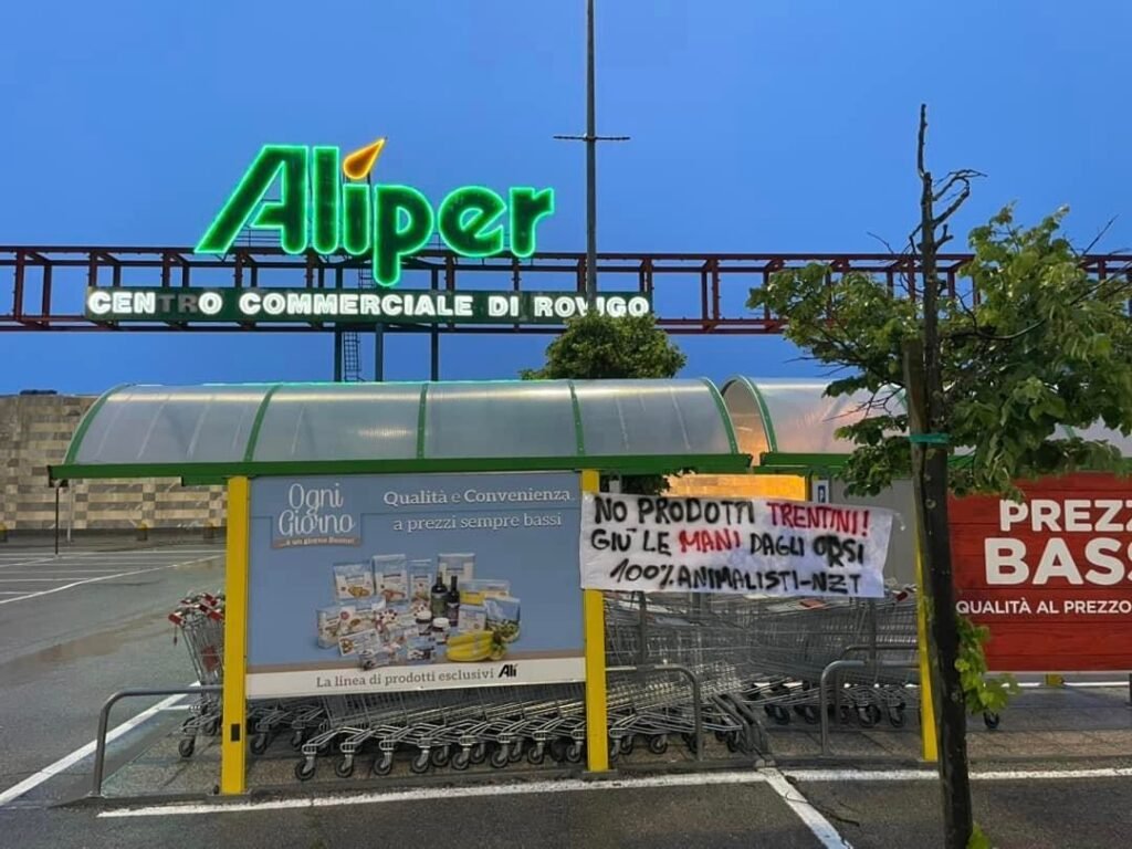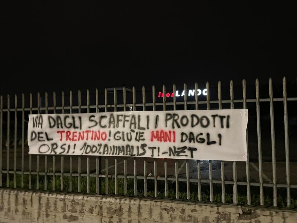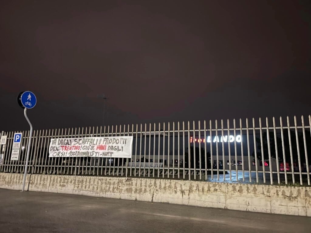 Militanti di CENTOPERCENTOANIMALISTI martedì sera 16 maggio, hanno compiuto nuove azioni in zona di Padova, Rovigo, Ferrara, attaccando striscioni di invito a non vendere prodotti del Trentino ai supermercati ALÌper (Rovigo) e Iper Tosano (Ferrara) e Iper Lando a Padova).