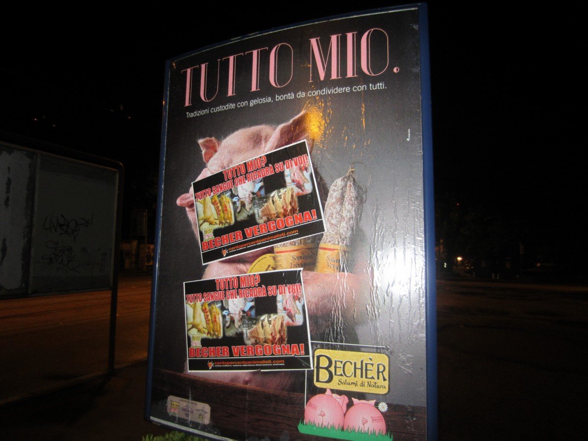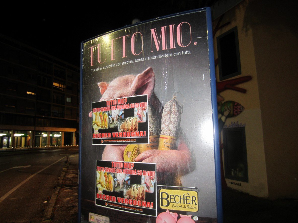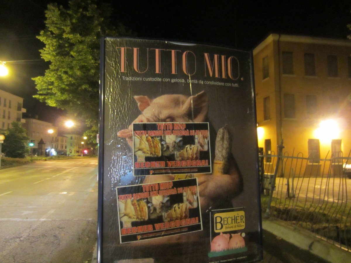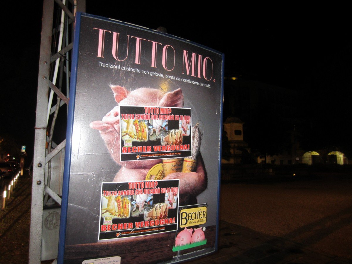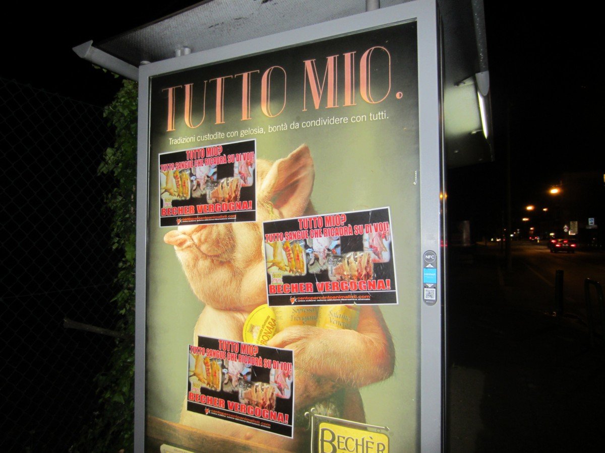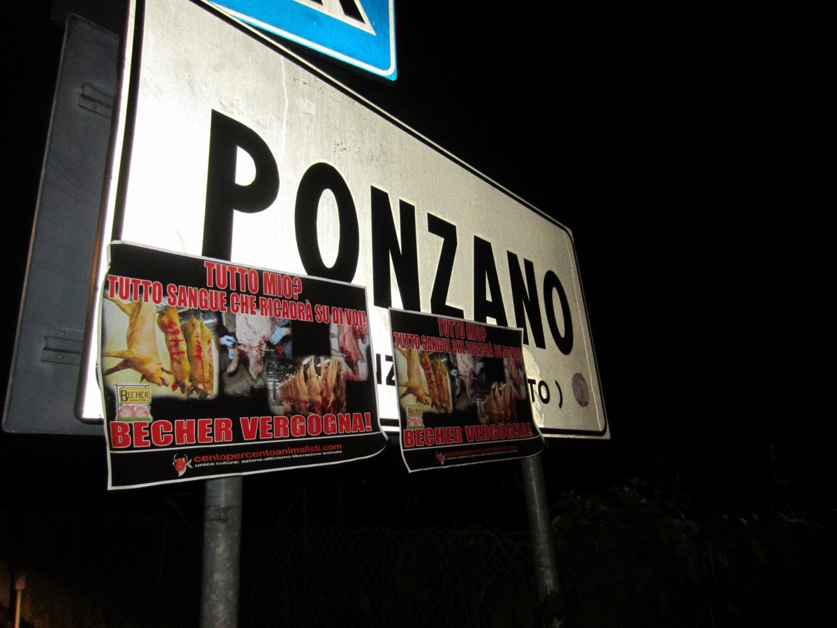 Nella notte tra il 15 e 16 maggio, Militanti di CENTOPERCENTOANIMALISTI hanno tappezzato la sede della “Becher” a Ponzano (Treviso) con locandine esplicita: “Tutto mio? Tutto sangue che ricadrà su di voi! BECHER VERGOGNA!”. A Padova invece, sono stati “oscurati” tutti i cartelloni pubblicitari.