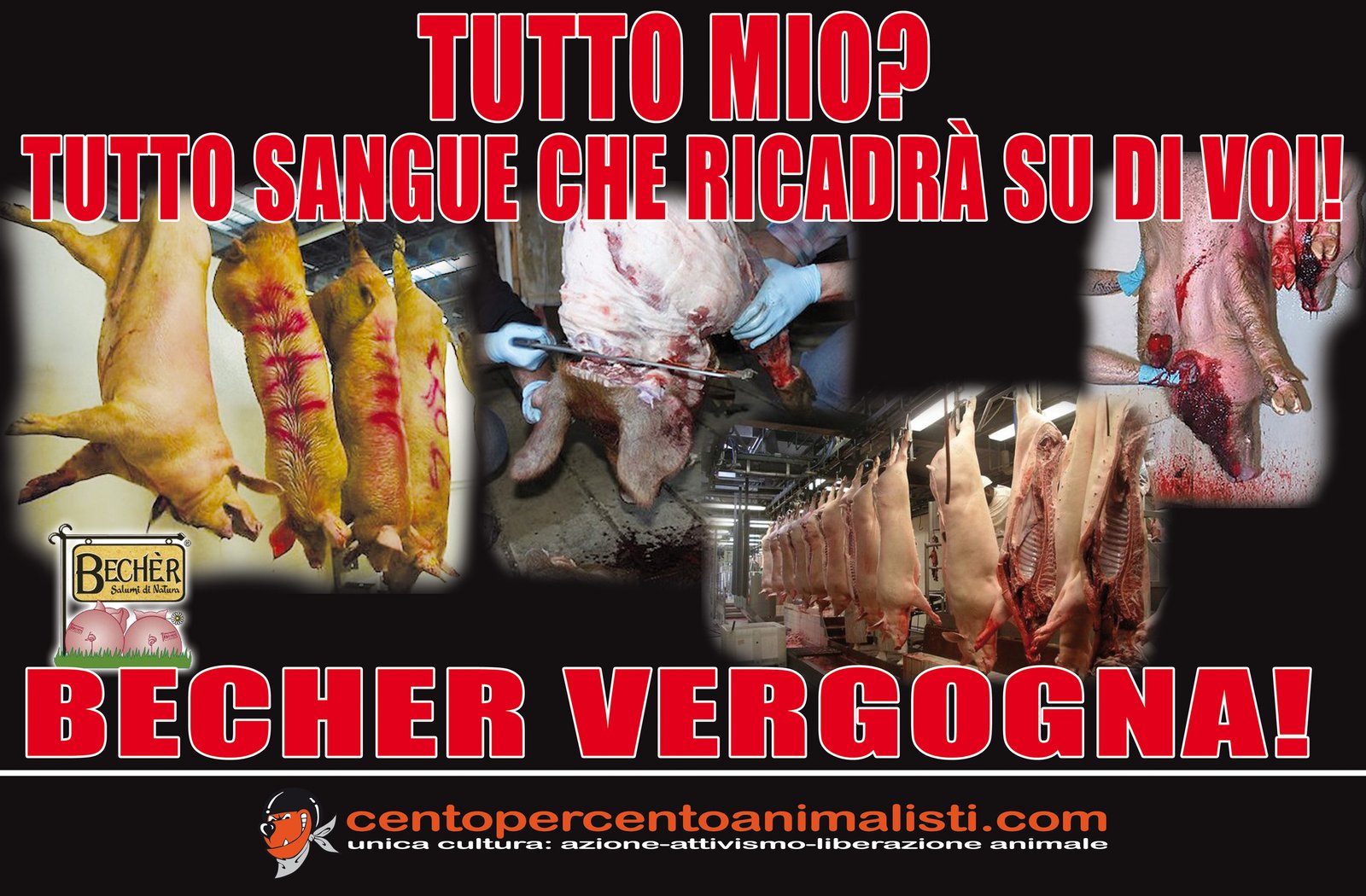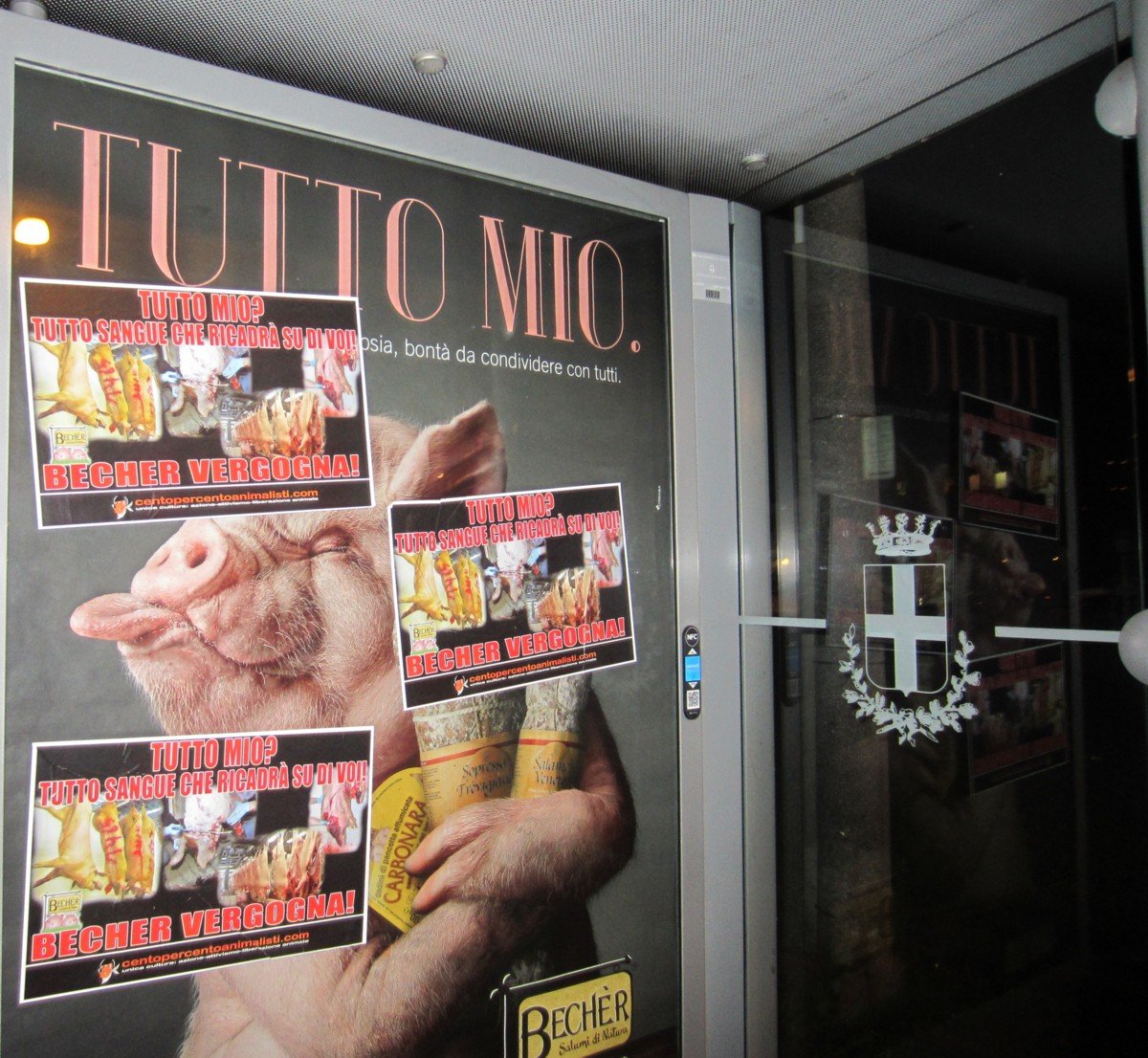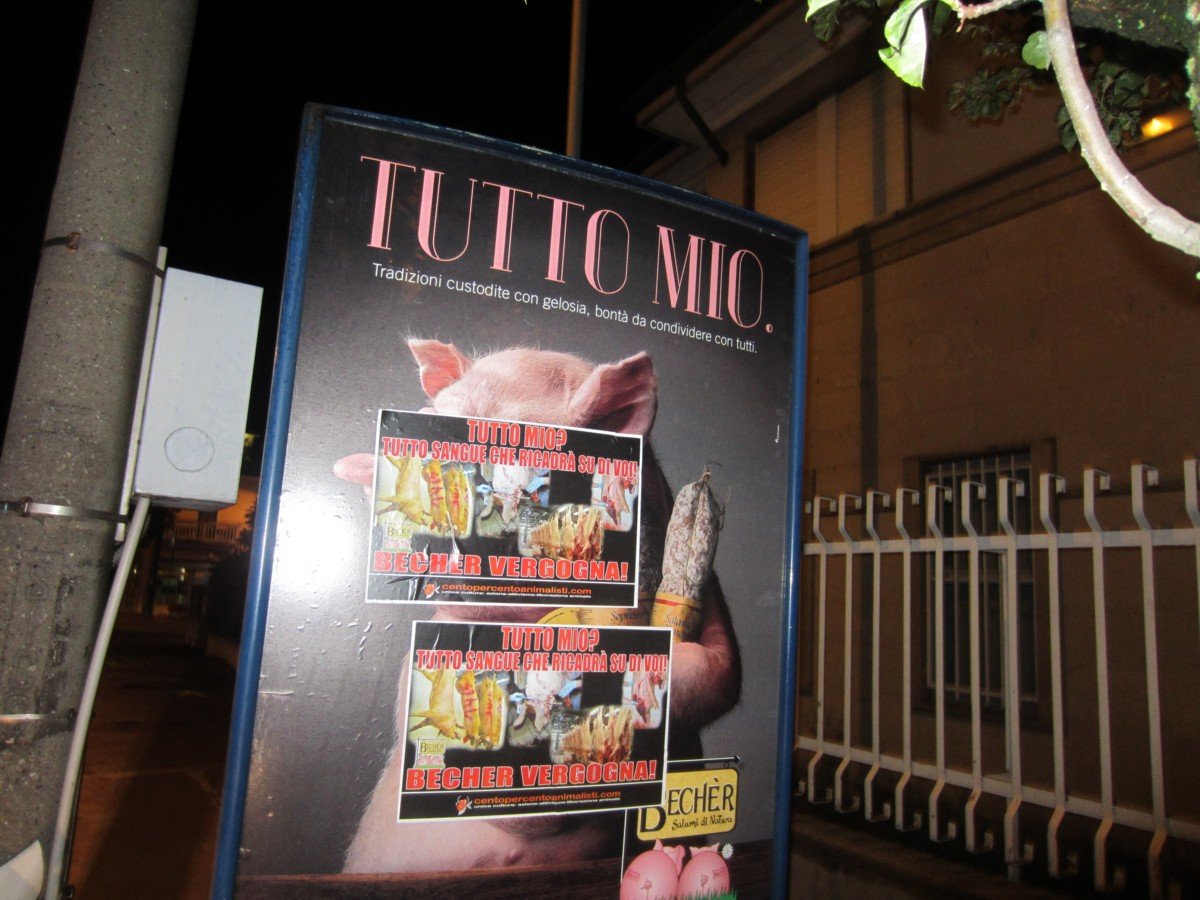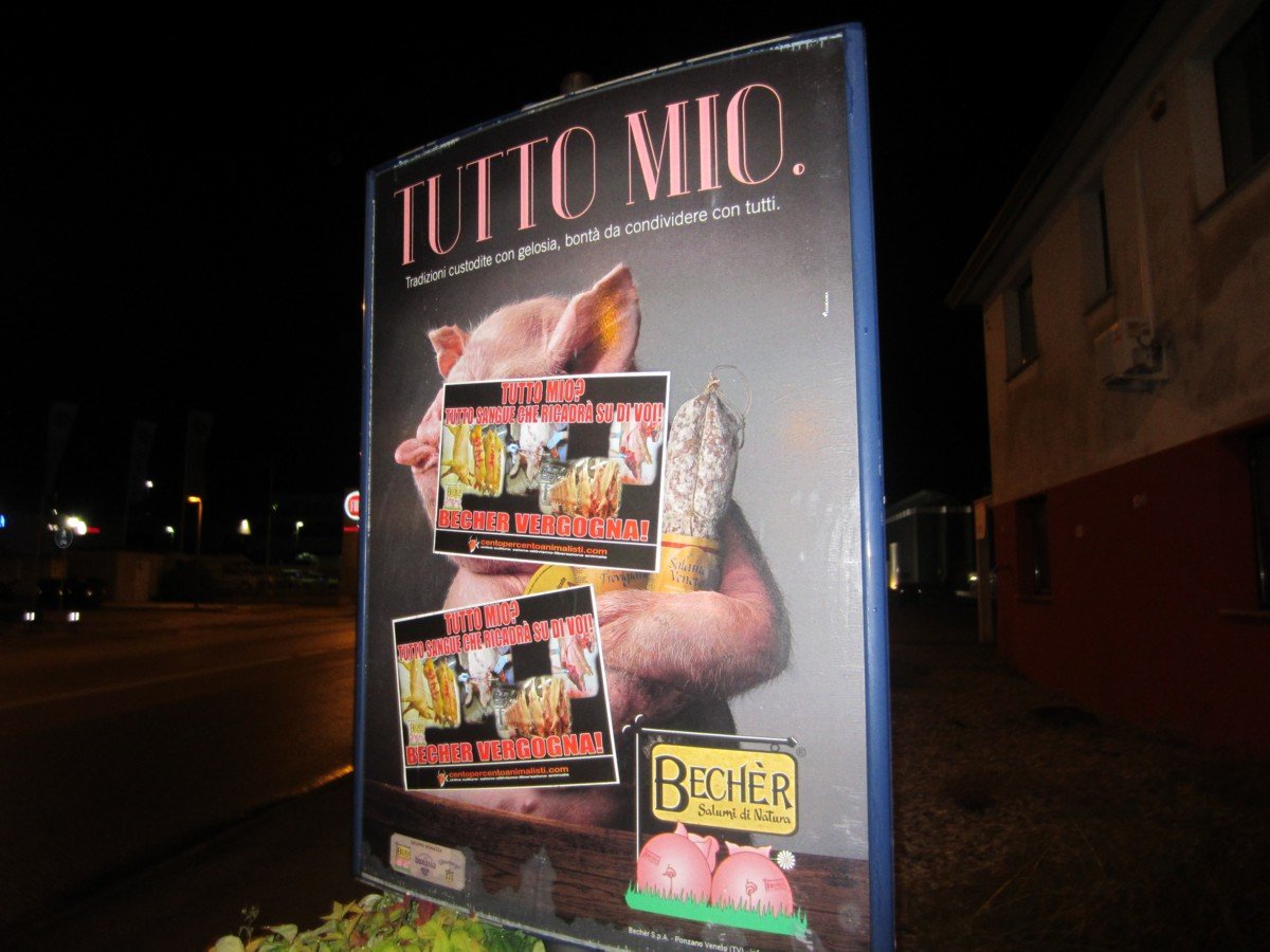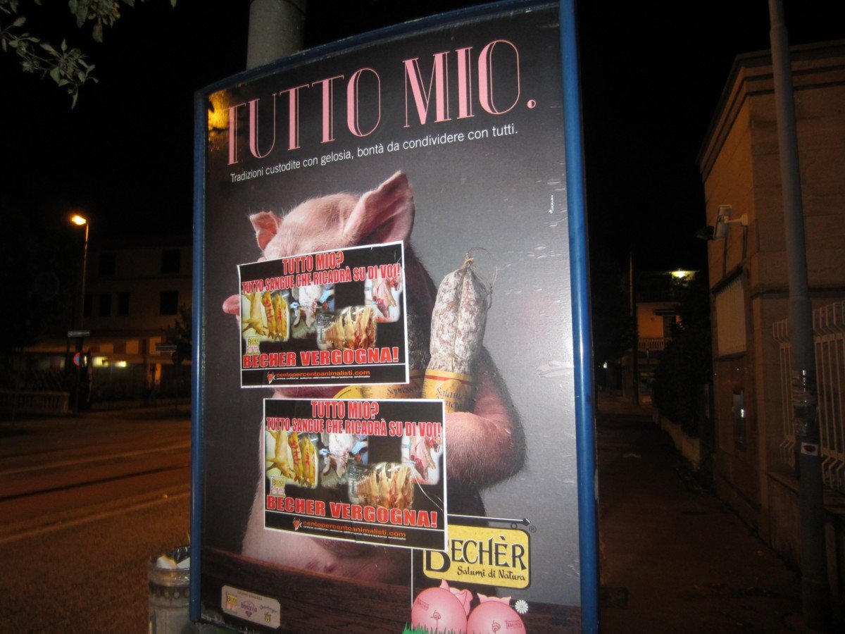 Nella notte tra il 15 e 16 maggio, Militanti di CENTOPERCENTOANIMALISTI hanno tappezzato la sede della “Becher” a Ponzano (Treviso) con locandine esplicita: “Tutto mio? Tutto sangue che ricadrà su di voi! BECHER VERGOGNA!”. A Padova invece, sono stati “oscurati” tutti i cartelloni pubblicitari.