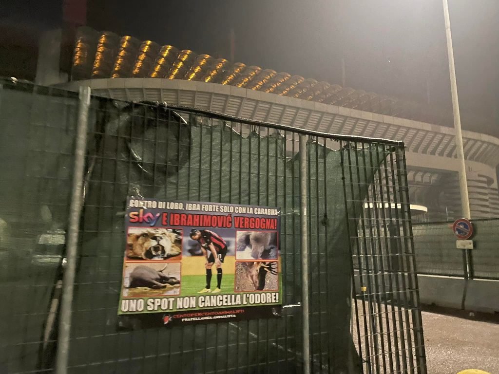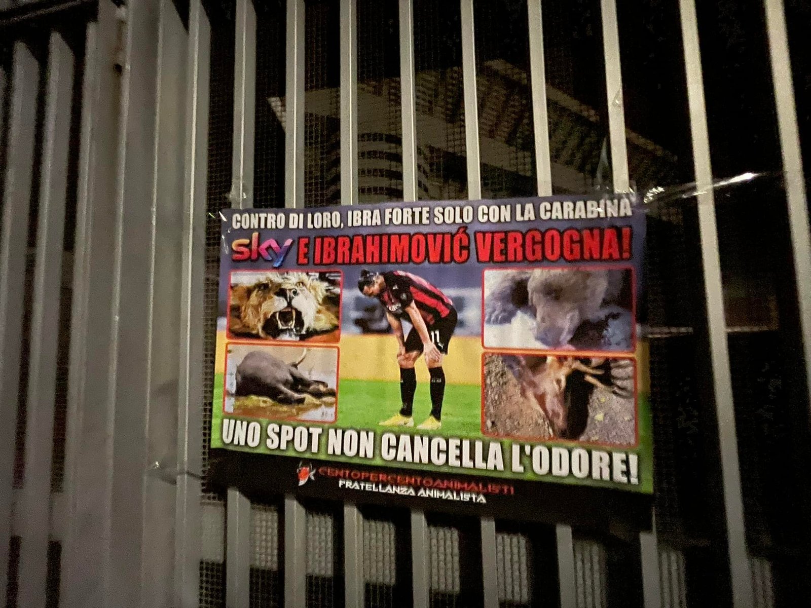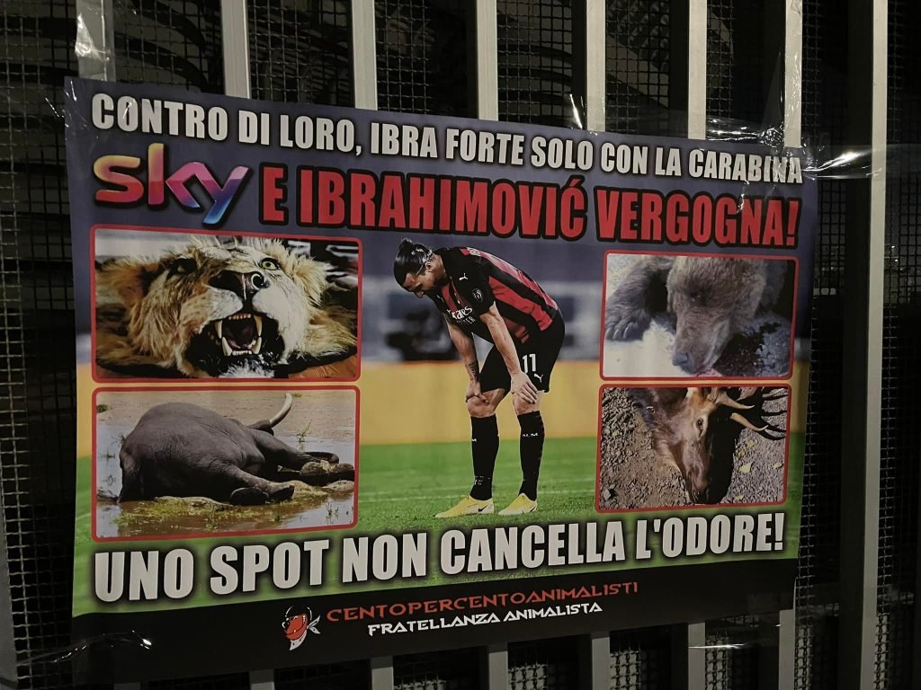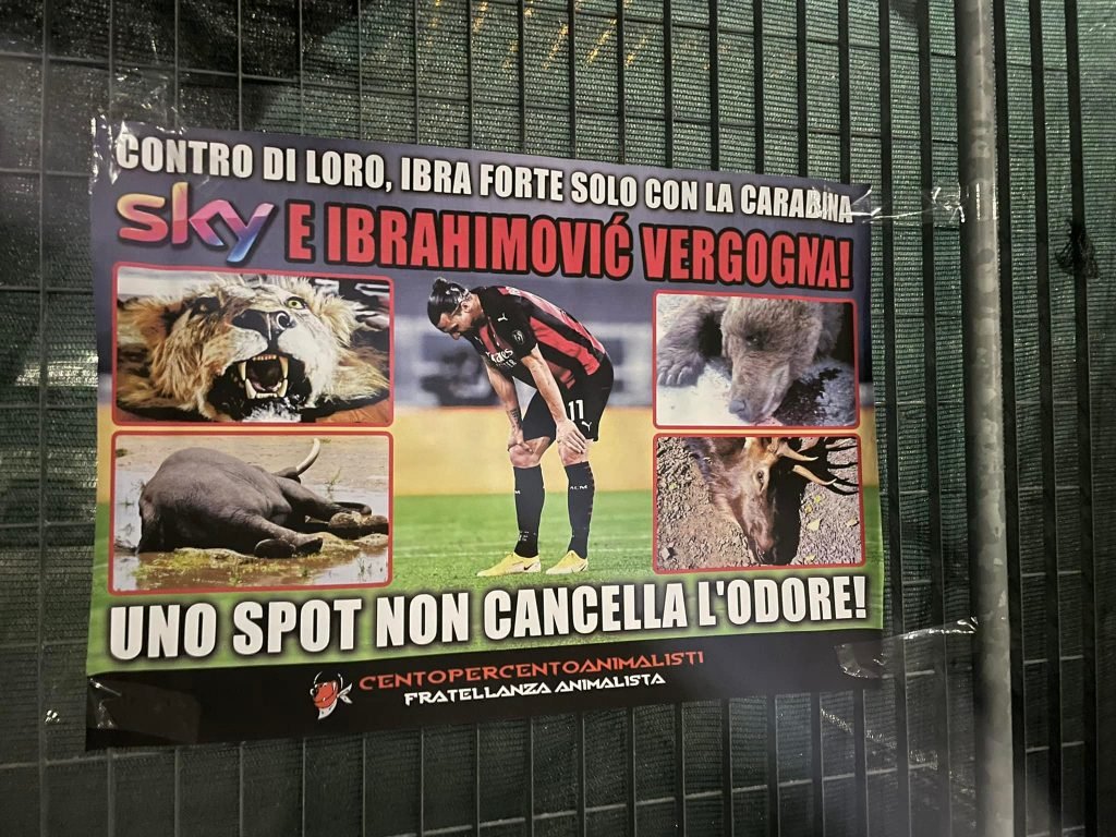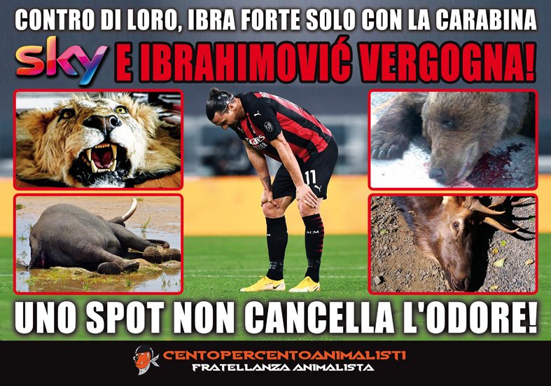 A questo punto, che dire di Ibra e della sua fibra? Nella notte tra il 20 e 21 gennaio, Militanti di CENTOPERCENTOANIMALISTI hanno affisso sui cancelli dello stadio Meazza San Siro di Milano, manifesti diretti a Ibra e Sky con scritto “contro di loro, Ibra è forte solo con la carabina. Sky e Ibrahimovic vergogna! Uno spot non cancella l’odore”. Il manifesto, oltre alla foto del centravanti, riportava le immagini di Animali trucidati dai cacciatori e del Leone che lo stesso Ibra ha ucciso anni fa.