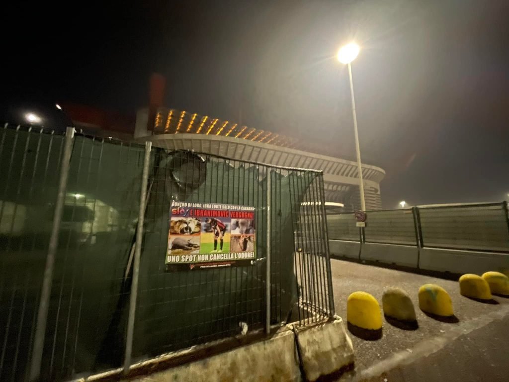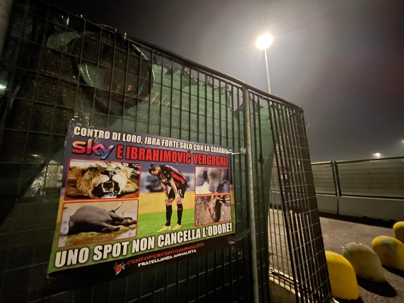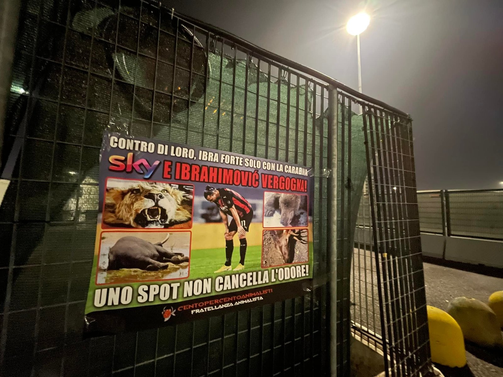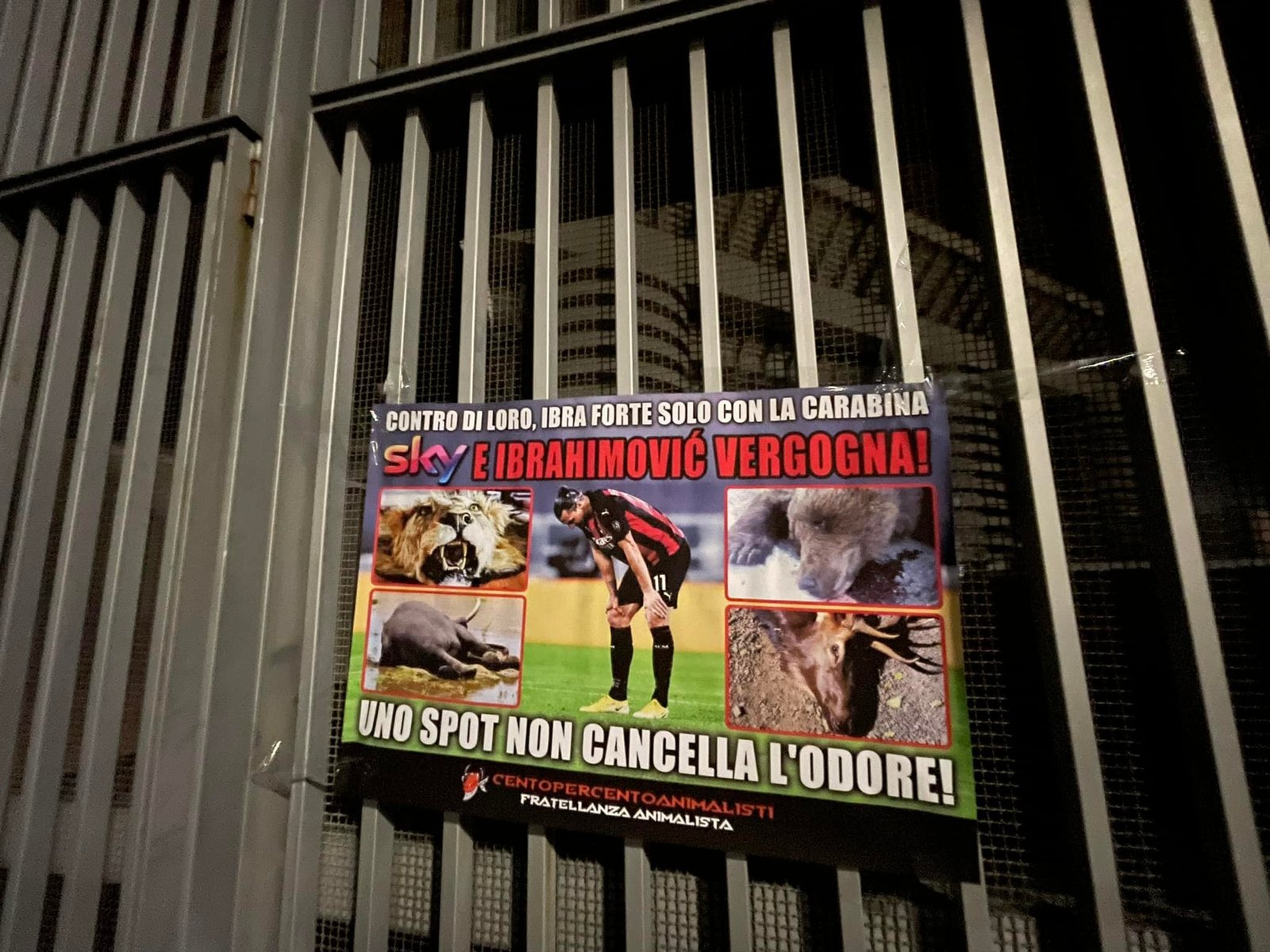 A questo punto, che dire di Ibra e della sua fibra? Nella notte tra il 20 e 21 gennaio, Militanti di CENTOPERCENTOANIMALISTI hanno affisso sui cancelli dello stadio Meazza San Siro di Milano, manifesti diretti a Ibra e Sky con scritto “contro di loro, Ibra è forte solo con la carabina. Sky e Ibrahimovic vergogna! Uno spot non cancella l’odore”. Il manifesto, oltre alla foto del centravanti, riportava le immagini di Animali trucidati dai cacciatori e del Leone che lo stesso Ibra ha ucciso anni fa.