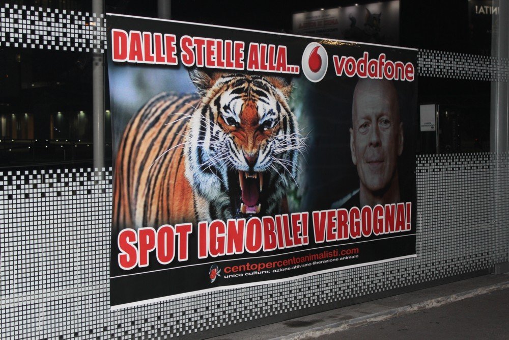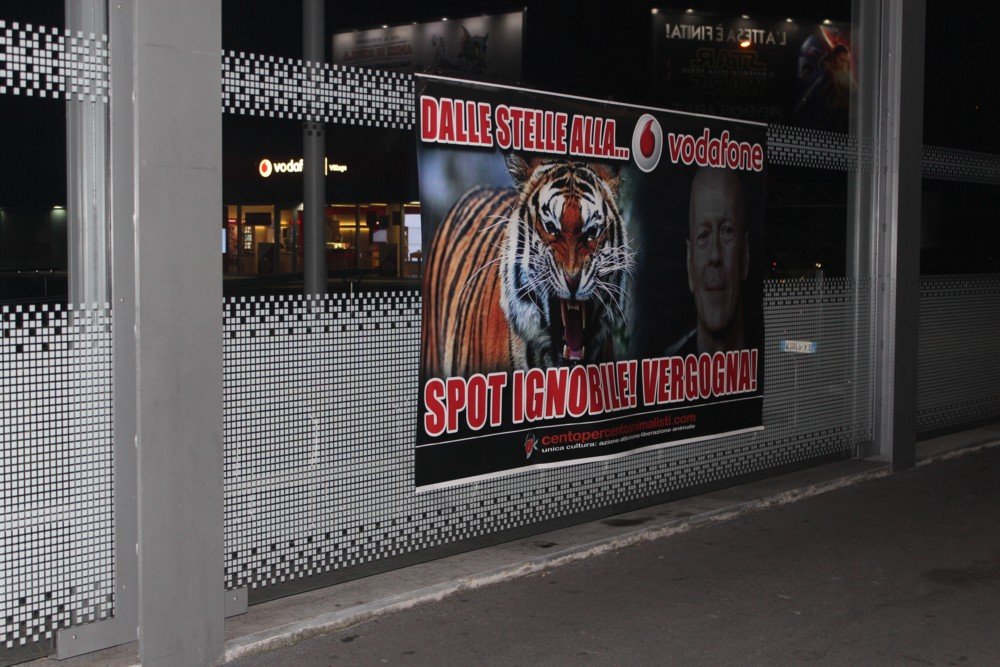 Per denunciare questa visione distorta della realtà, tanto più pericolosa in quanto chi guarda non si rende conto del suo reale significato, militanti del movimento CENTOPERCENTOANIMALISTI, nella notte tra il 24 e 25 ottobre, hanno affisso sulla recinzione del “vodafone village” in via Lorenteggio, 240 a Milano uno striscione gigante di protesta.