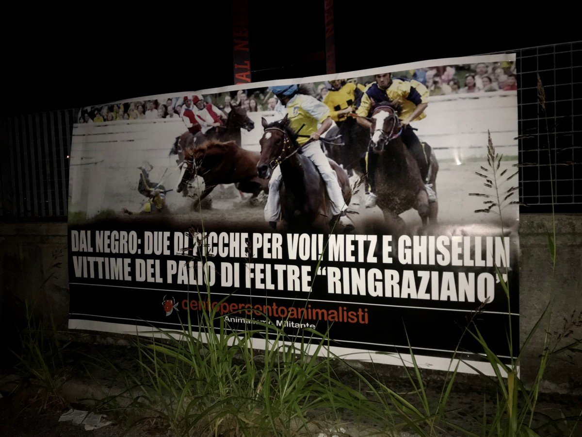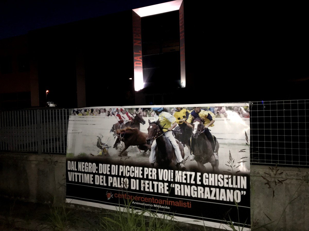 Le corse di Cavalli sono barbarie che devono cessare! Militanti di CENTOPERCENTOANIMALISTI, nella notte tra il 27 e 28 giugno, hanno pensato di ricordare alla prestigiosa azienda che supportare chi provoca la sofferenza non è una bella iniziativa. Uno striscione gigante è stato affisso sui cancelli della Dal Negro in piazza Cavarzerani a Carbonera (Treviso).