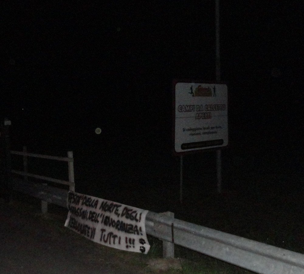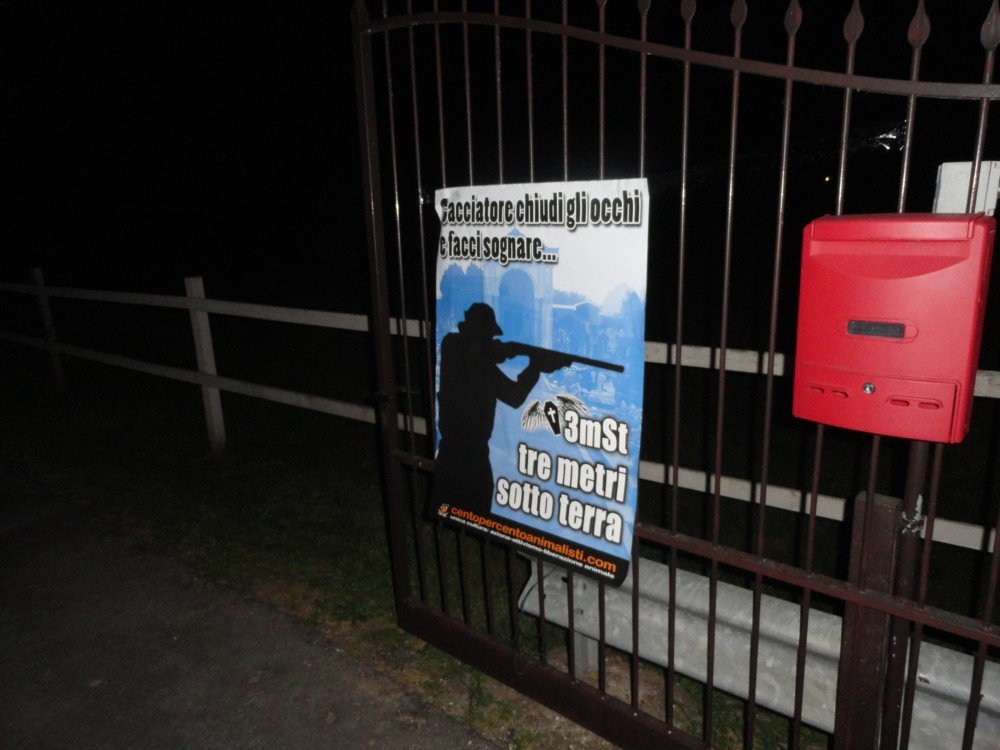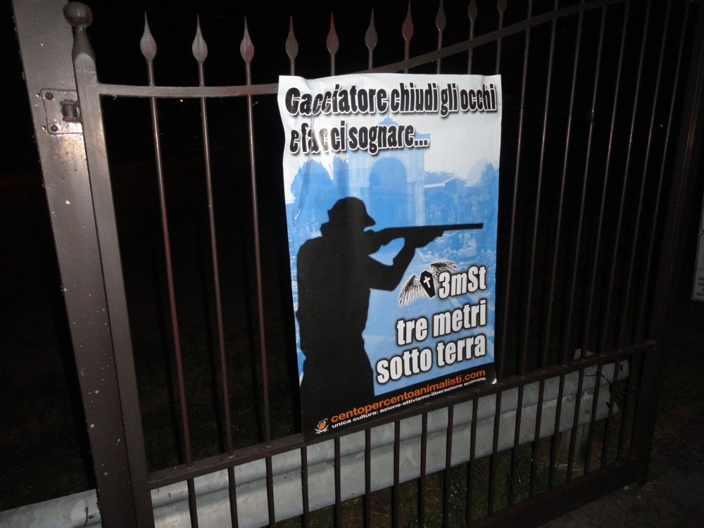 Un’occasione per ribadire il nostro “NO” ad attività distruttive come caccia e pesca, che non hanno nessuna giustificazione: nella notte tra il 23 e il 24 aprile, militanti di CENTOPERCENTOANIMALISTI hanno affisso sui cancelli del Palalago di Marola, manifesti di “buon auspicio” per i cacciatori e due striscioni , uno diretto agli organizzatori e uno sprezzante diretto a Sergio Berlato.