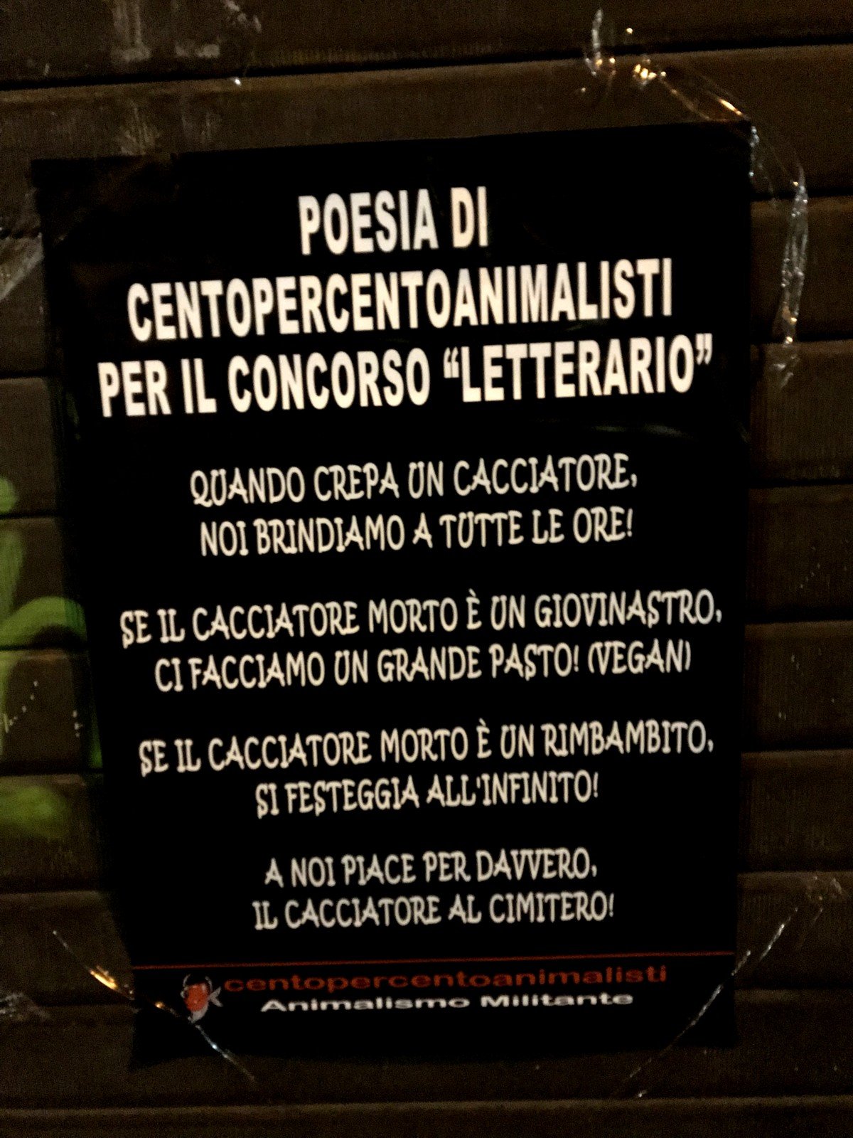 Nella notte tra il 14 e 15 marzo, Militanti di CENTOPERCENTOANIMALISTI hanno pensato di “partecipare” ai due concorsi e, dato che il negozio era chiuso, le opere, una tristemente reale e l’altra ironica, sono state affisse sulla serranda della lavanderia Lavalux, in via Gian Domenico Romagnosi, 32 a Trento.