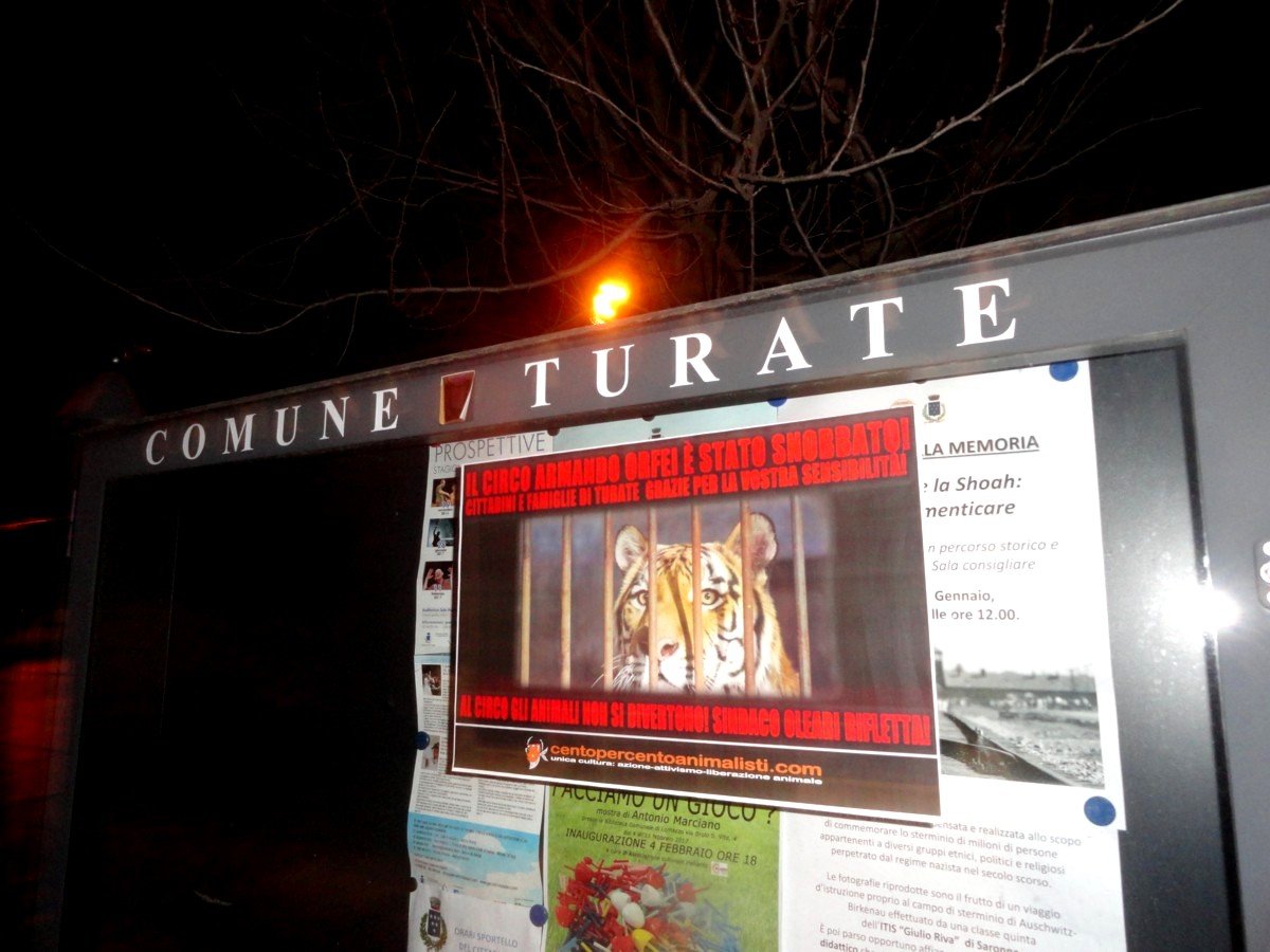 Noi di Centopercentoanimalisti lo consideriamo un fatto positivo, significa che un paese di tutto rispetto come Turate, ha snobbato gli spettacoli circensi. Il Sindaco Oleari, dopo il nostro blitz, aveva dichiarato che nel circo ci sono persone che lavorano, peccato che non abbia pensato nemmeno per un minuto agli Animai sfruttati e prigionieri che soffrono per la liberà negata dai circensi.