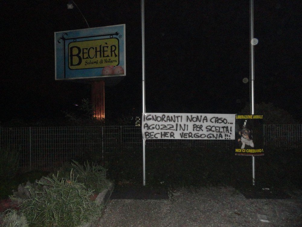 Nella notte tra il 20 e 21 ottobre, militanti di Centopercentoanimalisti hanno affisso sui pali dell’azienda di Ponzano Veneto in via Postumia, 36 uno striscione con scritto: “IGNORANTI NON A CASO… AGUZZINI PER SCELTA! BECHER VERGOGNA!”