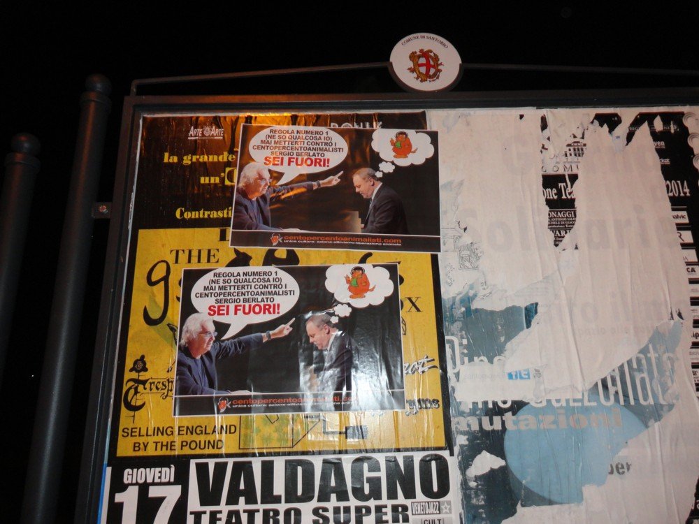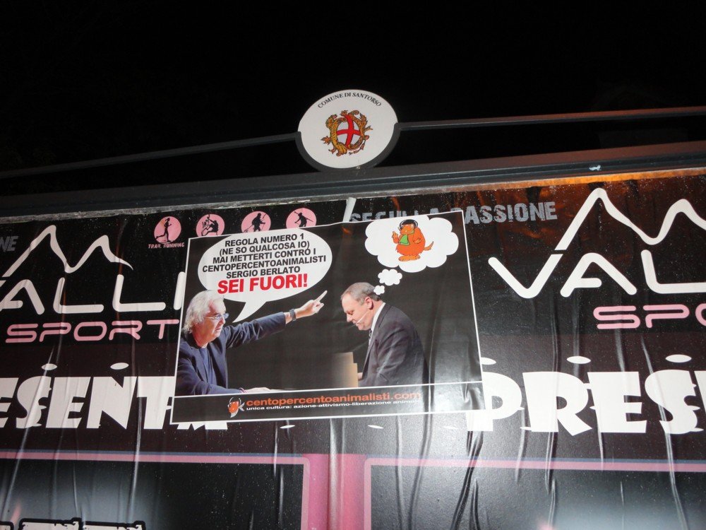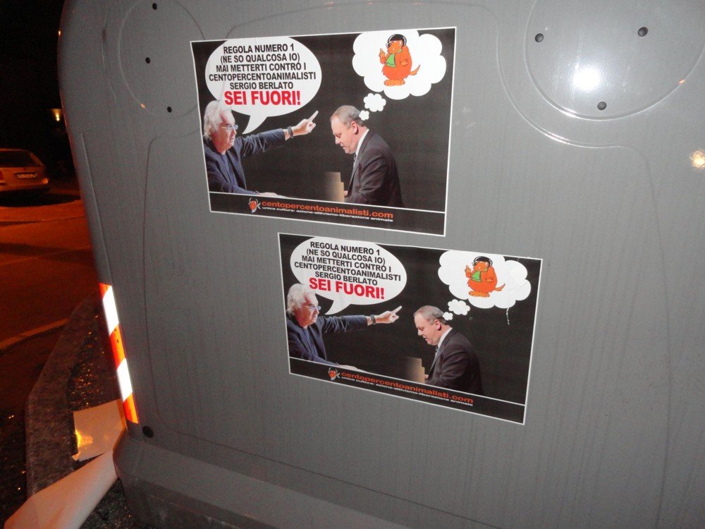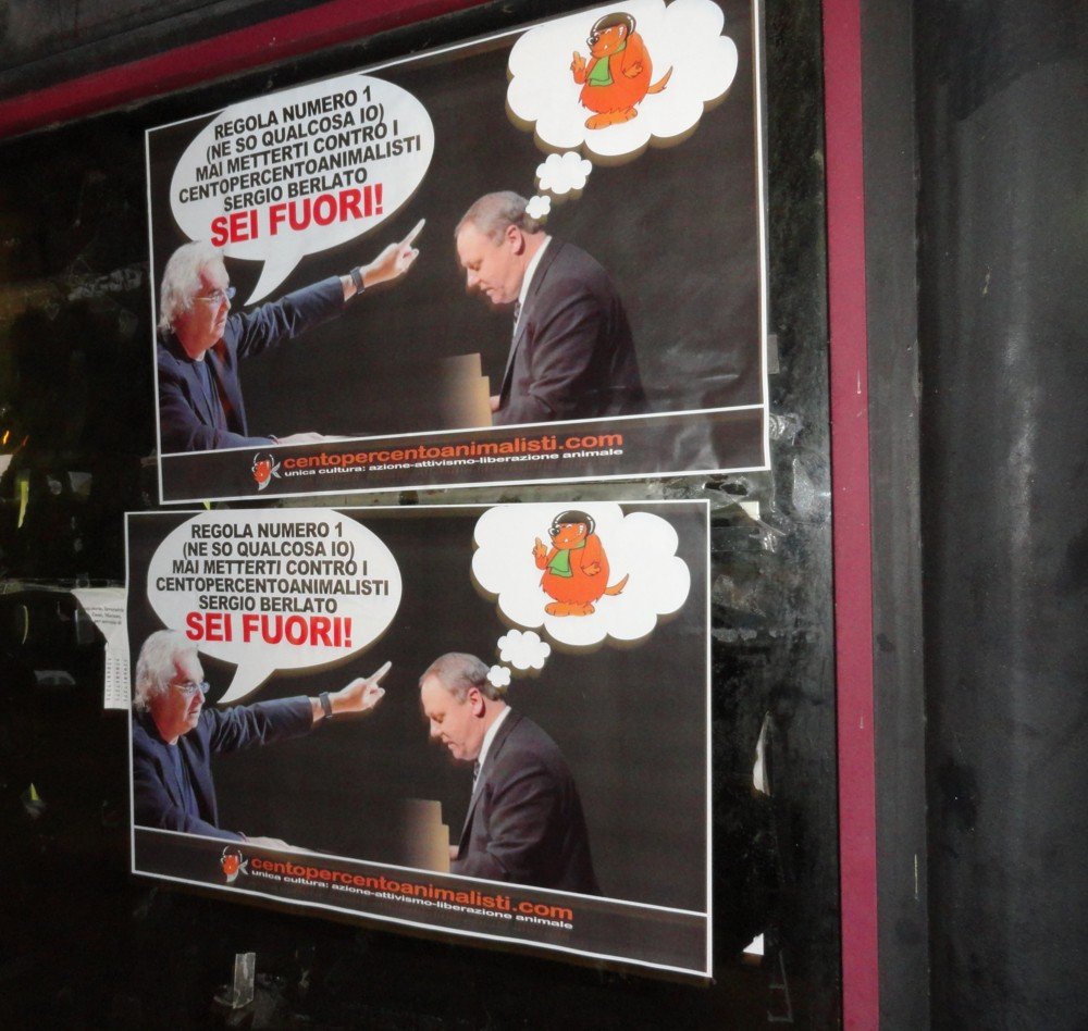 Nella locandina affissa in ogni angolo del piccolo paese Vicentino, nella notte tra il 17 e il 18 aprile, si vede Briatore (nei panni del conduttore di apprentice) che ammonisce un Berlato sconsolato: “Regola numero uno: mai metterti contro Centopercentoanimalisti, Sergio Berlato SEI FUORI!” E Briatore ne sa qualcosa: quando ebbe l’infelice idea di mostrarsi in veste di cacciatore, la campagna scatenata da noi lo costrinse a scusarsi pubblicamente su twitter.