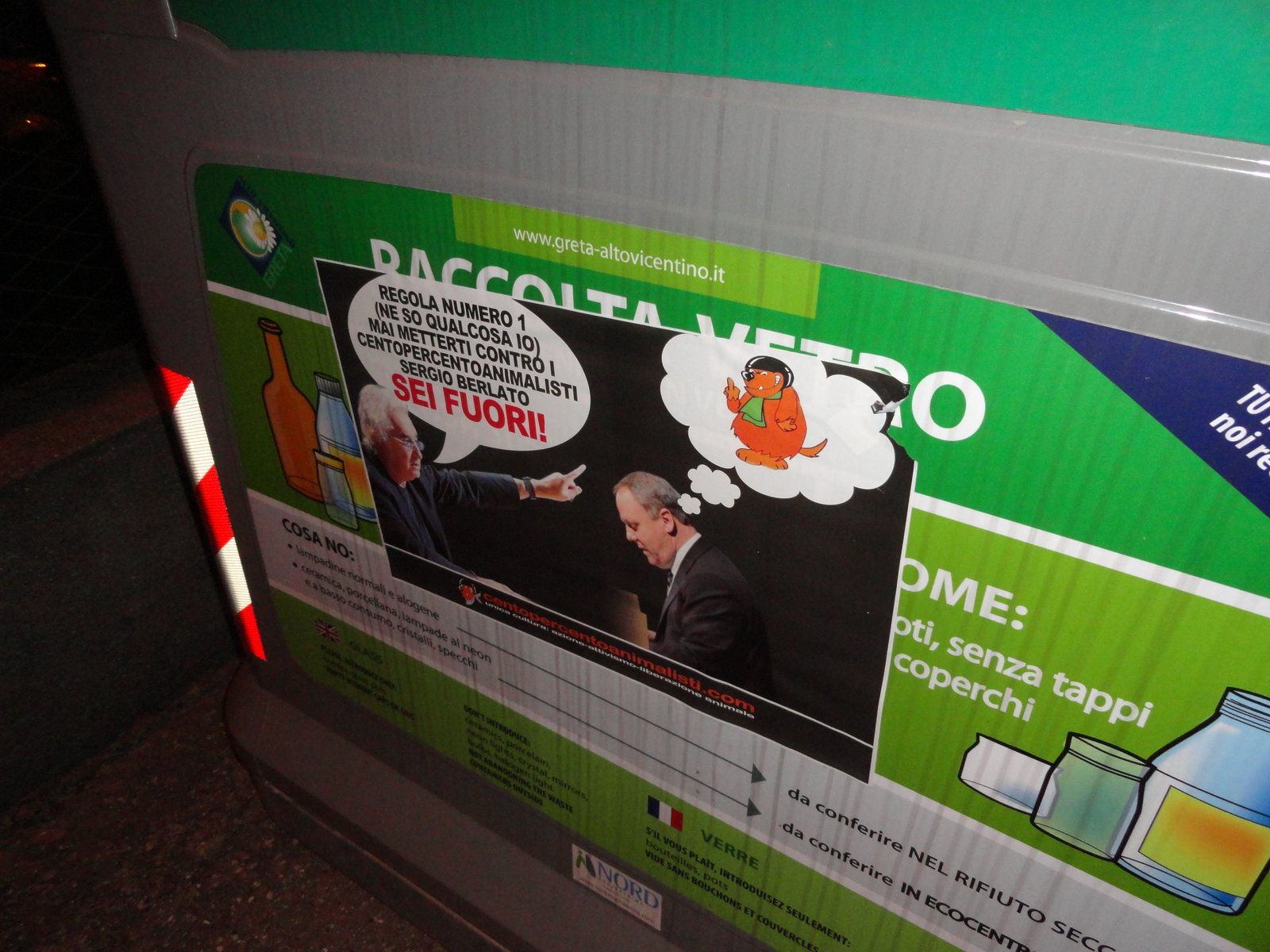 Noi CENTOPERCENTOANIMALISTI abbiamo fama di essere poco diplomatici con gli aguzzini di Animali. Infatti abbiamo deciso di infierire sul povero Sergio Berlato, già abbastanza distrutto dalle sue disavventure politiche, andando a trovarlo direttamente nel SUO paese, Santorso in provincia di Vicenza, con un blitz notturno irriverente, ironico…