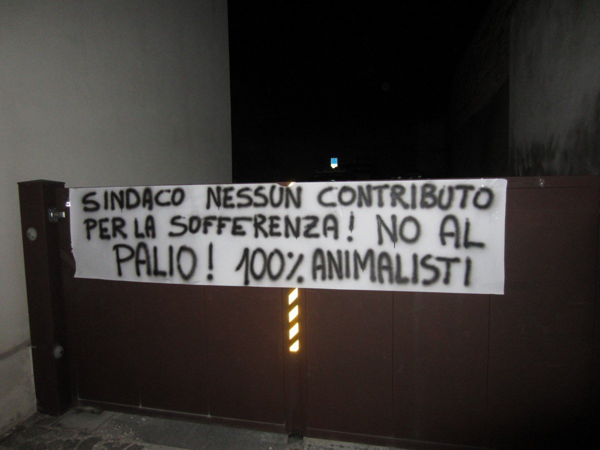 Grossa soddisfazione per noi CENTOPERCENTOANIMALISTI, che da anni non manchiamo all’appuntamento per contestare la corsa, gli organizzatori, i fantini e anche il pubblico beota che la sostiene con la propria partecipazione. E, anno dopo anno, abbiamo visto le presenze di spettatori calare sempre più, fino agli spalti semivuoti del 2016: e questo, pensiamo senza presunzione, grazie soprattutto e unicamente alla nostra presenza attiva in tutti questi anni.