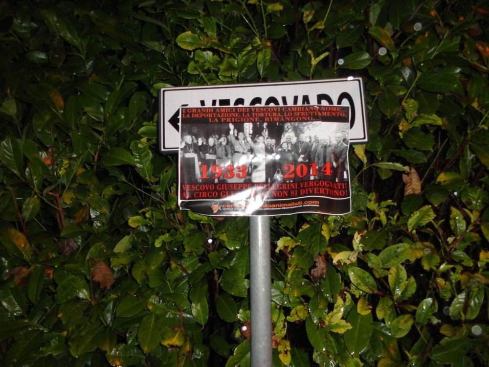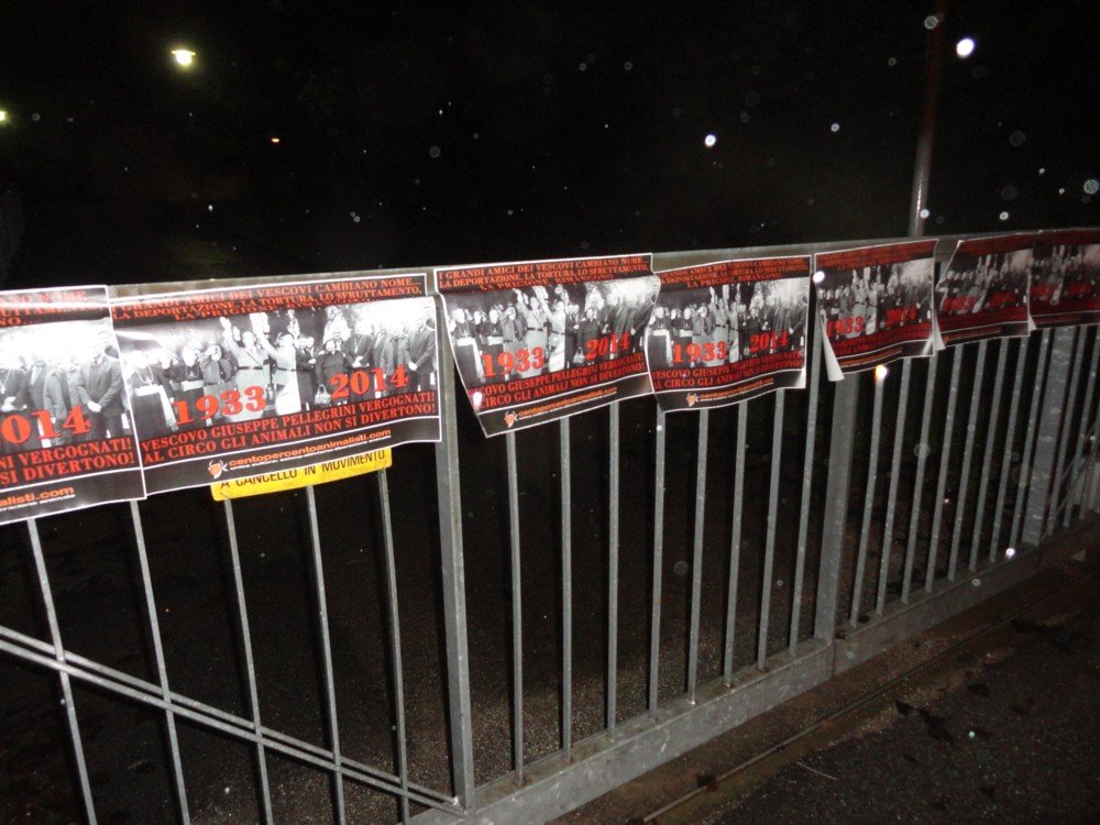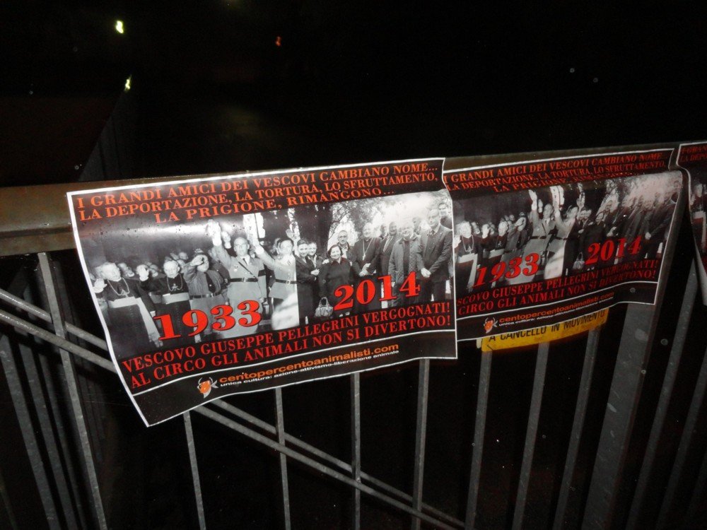 Militanti dei CENTOPERCENTOANIMALISTI, nella notte tra l’11 e 12 novembre, hanno espresso il loro dissenso affiggendo locandine di protesta pungenti sui cancelli della diocesi di Pordenone che ricordano come la chiesa cattolica romana è sempre stata dalla parte dei potenti, degli sfruttatori. Ieri ha appoggiato i nazisti oggi i circensi che non sono diversi nei metodi per sottomettere e sfruttare esseri senzienti come i poveri animali.