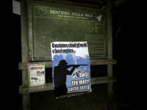 Nella notte tra il 24 e 25 luglio, Militanti di Centopercentoanimalisti hanno posizionato manifesti ironici di buon auspicio contro la caccia, in  zona Vezzena (levico Terme- Trento), in particolare tappezzata  la malga Biscotto che ha inglobato  malga sassi. I turisti sappiano chi sono gli amici dei cacciatori.