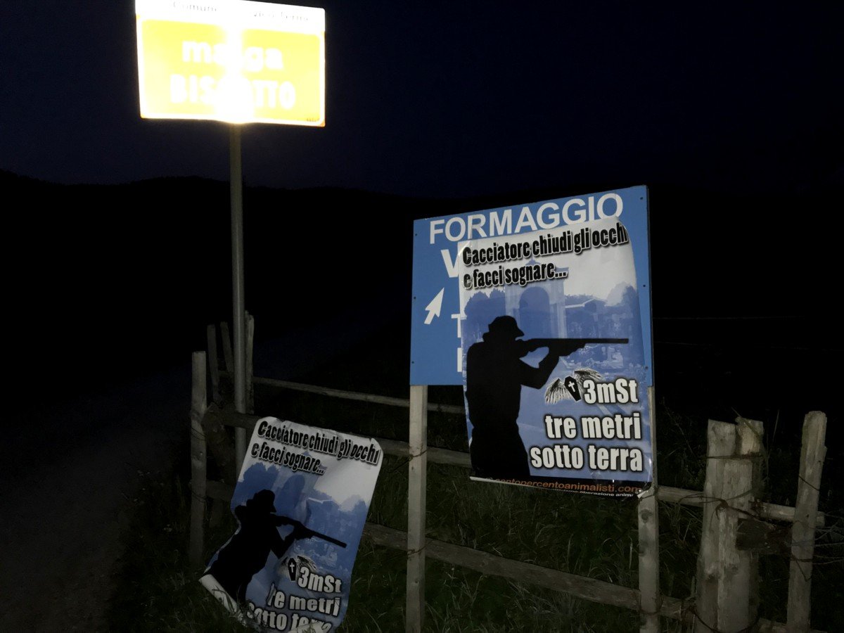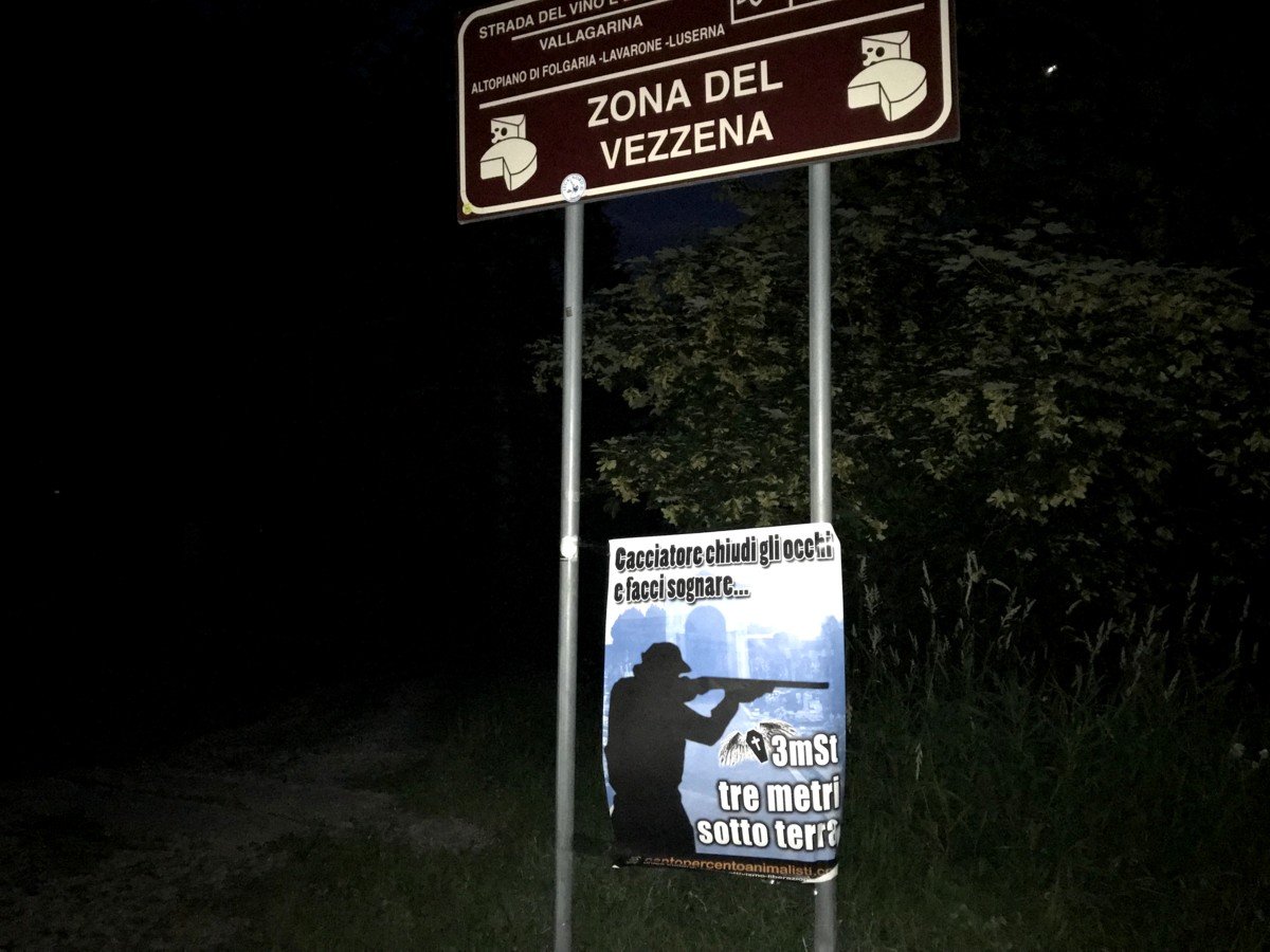 Nella notte tra il 24 e 25 luglio, Militanti di Centopercentoanimalisti hanno posizionato manifesti ironici di buon auspicio contro la caccia, in  zona Vezzena (levico Terme- Trento), in particolare tappezzata  la malga Biscotto che ha inglobato  malga sassi. I turisti sappiano chi sono gli amici dei cacciatori.