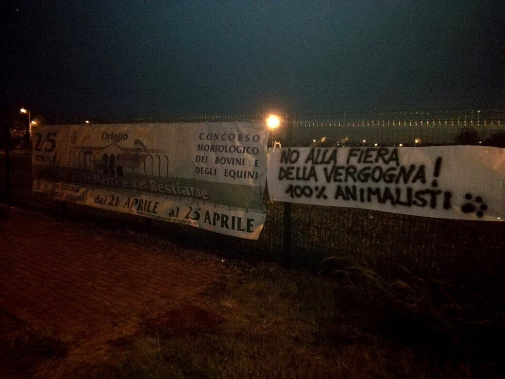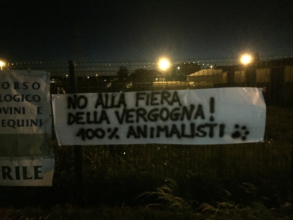 Per questo militanti di CENTOPERCENTOANIMALISTI nella notte tra il 19 e 20 aprile hanno affisso sui cancelli della fiera, uno striscione che la chiama col suo vero nome: “NO ALLA FIERA DELLA VERGOGNA!”