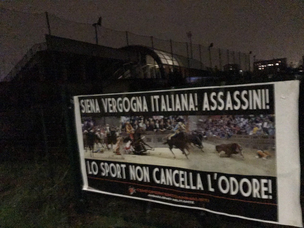 Militanti di CENTOPERCENTOANIMALISTI, nella notte tra il 19 e 20 novembre, in occasione della partita di calcio del Siena che si giocherà mercoledì prossimo, hanno affisso sui cancelli di fianco alle tribune dello stadio Speroni a Busto Arsizio, uno striscione enorme rivolto a tutta la città di Siena, in primis al sindaco che ha il coraggio di dirsi “offeso” per le critiche che arrivano da ogni persona di coscienza. A lui, a tutti gli sponsor e supporter, ai beoti che vanno a vederlo diciamo: “SIENA VERGOGNA ITALIANA! ASSASSINI! LO SPORT NON CANCELLA L’ODORE!