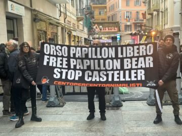 Giovedì 26 marzo, nel tardo pomeriggio, attivisti di CENTOPERCENTOANIMALISTI hanno esposto uno striscione nel centro di Padova, per ricordare la vicenda dell’Orso Papillon, recluso da anni nel centro faunistico del Casteller (Trento). Sul posto