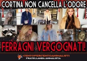 Per noi la pelliccia è un capo volgare, indossato per ostentazione, inutile, ma soprattutto prodotto con la sofferenza e la morte di milioni di Animali. A Cortina, capitale della pelliccia, troviamo in corso Italia una botique della Ferragni. Noi CENTOPERCENTOANIMALISTI abbiamo fatto vari blitz a Cortina e tenuto due memorabili presidi antipelliccia, tanto che il sindaco del paese aveva chiesto (invano) al Prefetto di vietare le nostre manifestazioni.