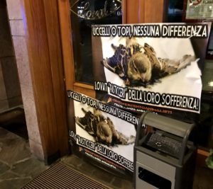 Doppia azione a Cortina dei nostri Militanti a Cortina, attaccati manifesti sulle vetrate del negozio di Chiara Ferragni (promotrice di pellicce) e alla pasticceria Lovat (colla per imprigionare e uccidere i Passerotti).