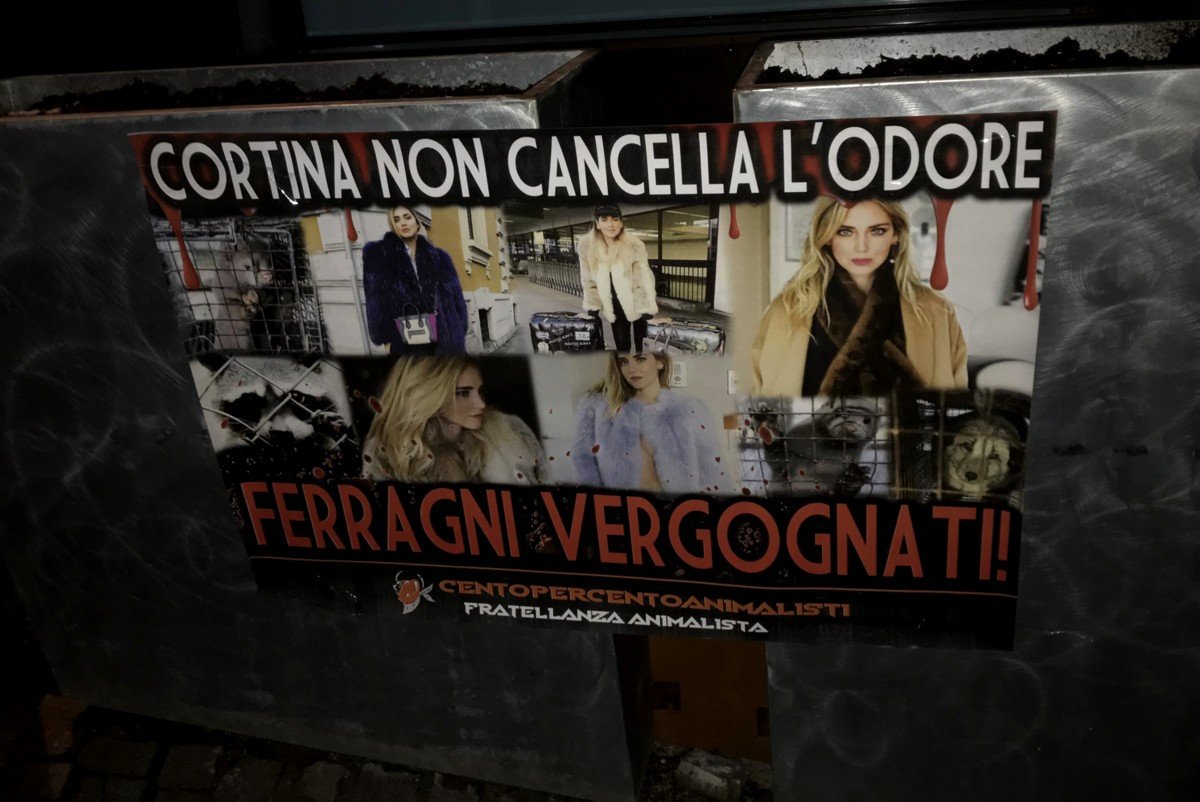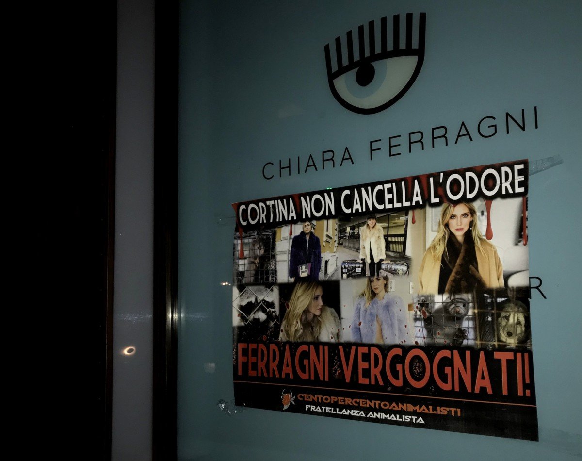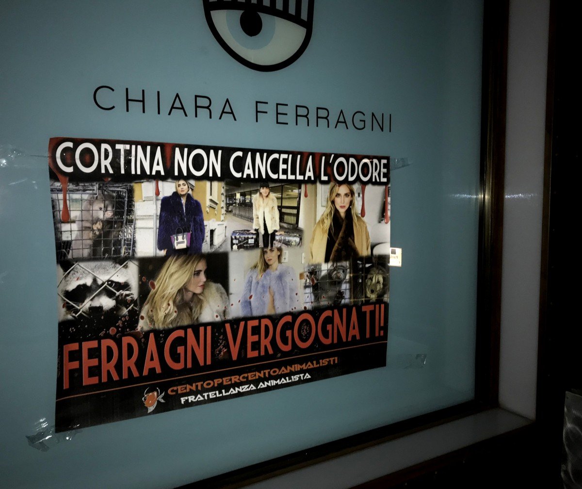 Per noi la pelliccia è un capo volgare, indossato per ostentazione, inutile, ma soprattutto prodotto con la sofferenza e la morte di milioni di Animali. A Cortina, capitale della pelliccia, troviamo in corso Italia una botique della Ferragni. Noi CENTOPERCENTOANIMALISTI abbiamo fatto vari blitz a Cortina e tenuto due memorabili presidi antipelliccia, tanto che il sindaco del paese aveva chiesto (invano) al Prefetto di vietare le nostre manifestazioni.