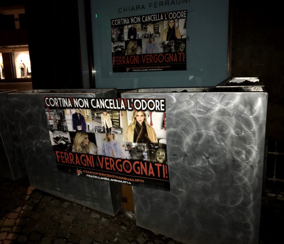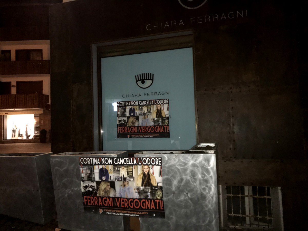 Per ribadire la nostra opinione su pellicce e su chi le commercia, chi le promuove o le indossa, nella notte tra il 16 e 17 ottobre, i nostri militanti hanno attaccato sulle vetrine del negozio della Ferragni a Cortina, un paio di manifesti personalizzati. Non sono escluse altre azioni, questa volta diurne, nel prossimo dicembre, mese di apertura del negozio.