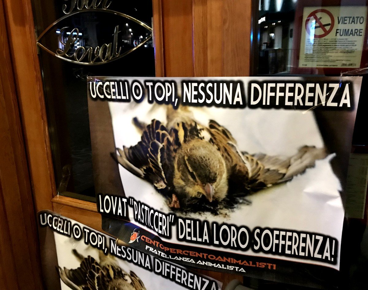 Militanti di CENTOPERCENTOANIMALISTI, nella notte tra 16 il e 17 ottobre hanno fatto una visitina alla pasticceria Lovat ed hanno affisso due manifesti diretti al proprietario. Sia chiaro: la vergogna non verrà dimenticata.