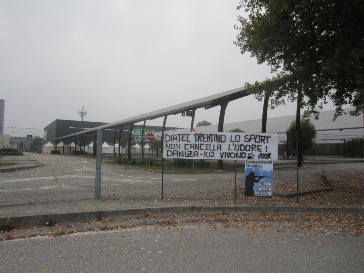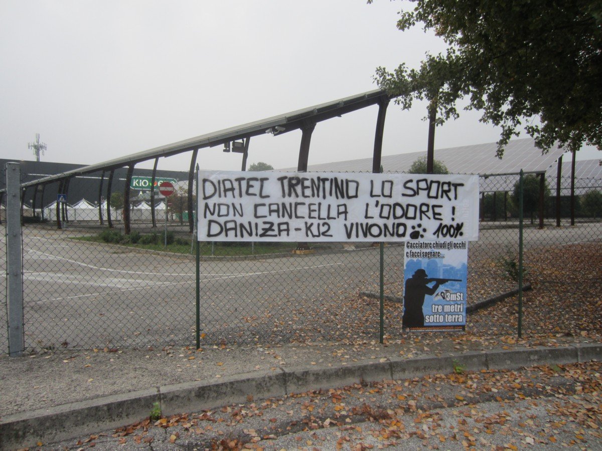 Sabato 21 ottobre, nel tardo pomeriggio, Militanti di CENTOPERCENTOANIMALISTI hanno affisso un manifesto ironico contro i cacciatori e uno striscione sui cancelli del Kioene Arena di Padova (la compagine Trentina domenica 22 ottobre affronterà quella Padovana), per ricordare a Ugo Rossi e compari che le uccisioni di Daniza e KJ2 non sono e non saranno mai dimenticate, almeno da parte nostra. Ogni occasione sarà buona per ricordaglielo.